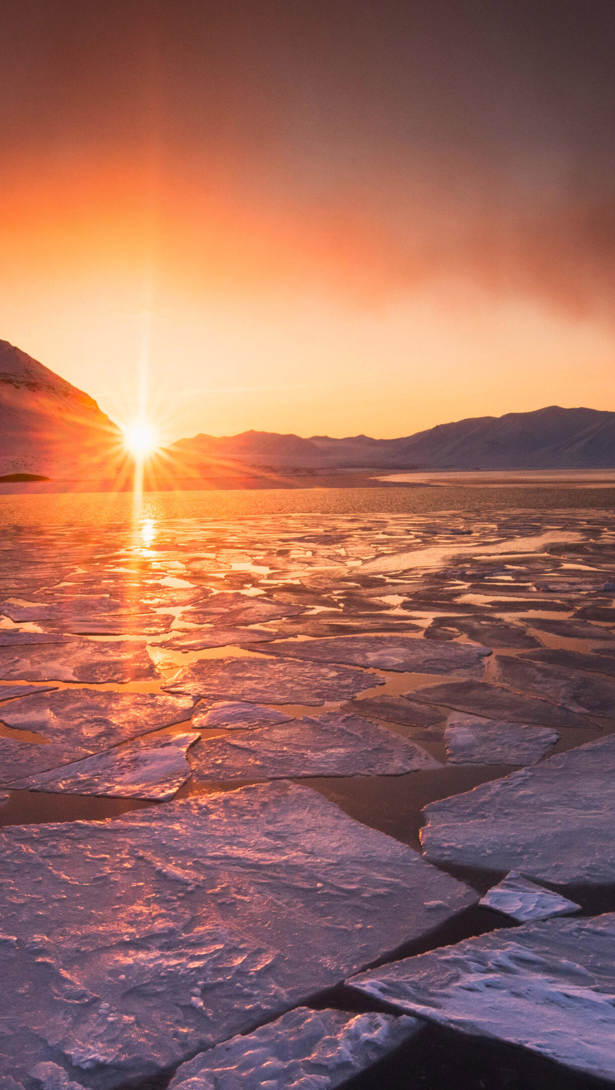 A breathtaking 4K wallpaper capturing the Midnight Sun over vast ice floes and towering snowy mountains in Svalbard, Norway. The brilliant orange sunburst creates a dramatic glow across the choppy, reflective ice and dark water, contrasting with the cool, shadowed mountains and sky.