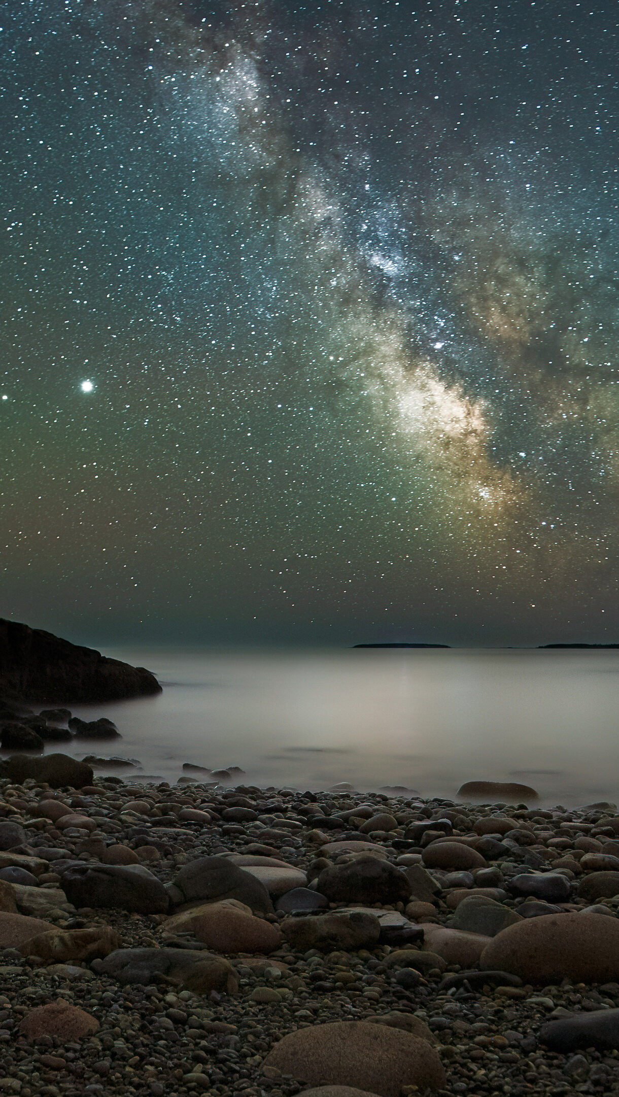 An awe-inspiring 4K wallpaper presents the Milky Way Galaxy stretching across the night sky above the rocky coast of Acadia National Park in Maine. The brilliant cascade of countless stars illuminates the expansive dark sky, contrasting beautifully with the serene, long-exposure ocean and rugged shoreline.