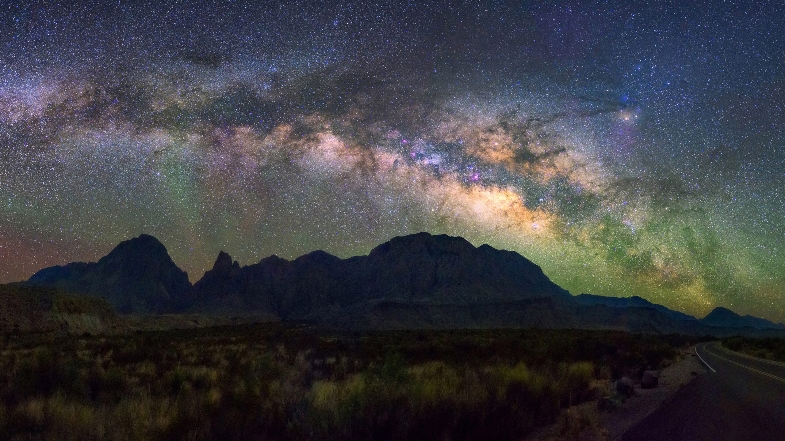 An awe-inspiring 4K wallpaper capturing the brilliant arc of the Milky Way Galaxy stretching across a vast, star-filled night sky above the silhouetted peaks of Big Bend National Park mountains. Vibrant cosmic dust lanes of purple, gold, and green illuminate the heavens, contrasting dramatically with the dark, rugged landscape below, creating a mood of profound nocturnal majesty.