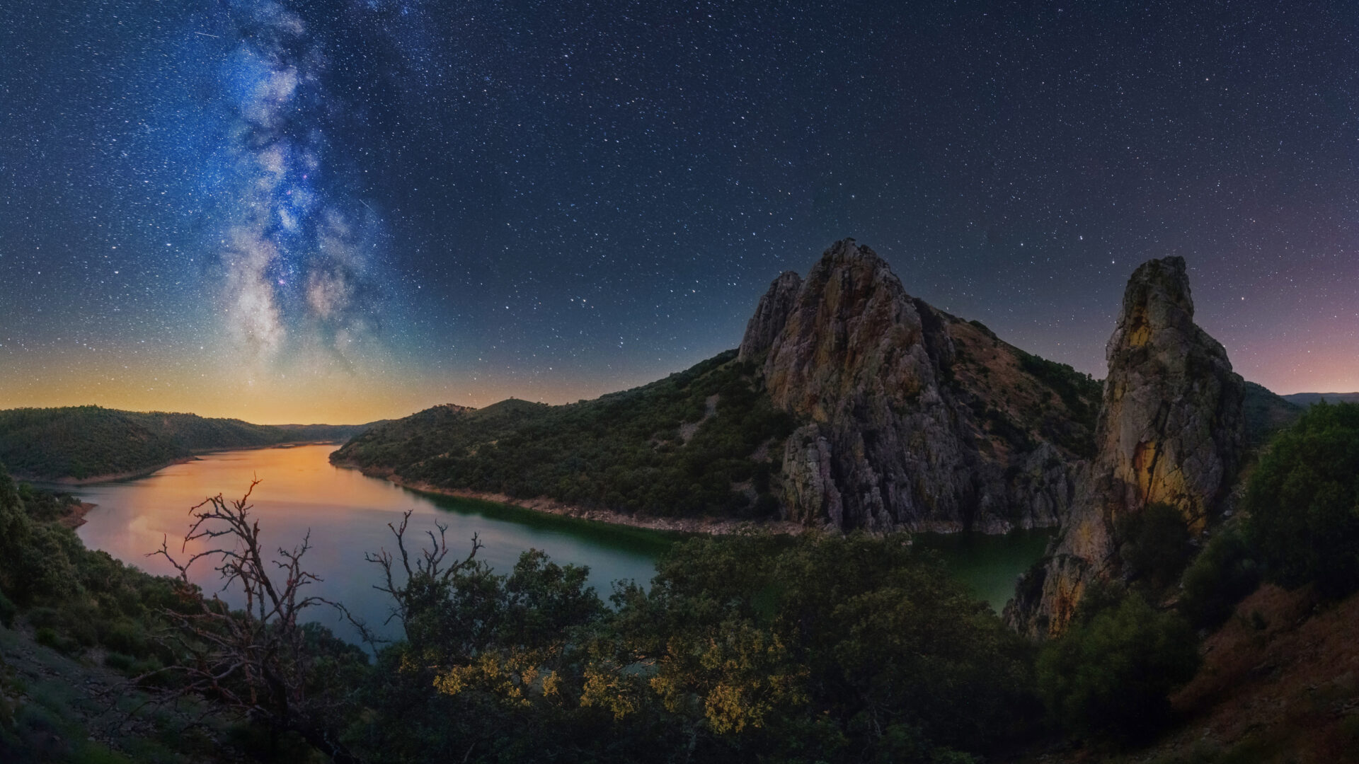 A breathtaking 4K wallpaper captures the stunning Milky Way arching across the night sky above the winding Tagus River in Monfragüe National Park, Spain. The celestial river of stars illuminates the vast dark landscape, with soft orange and blue hues reflecting on the calm river surface, evoking a profound sense of natural wonder.