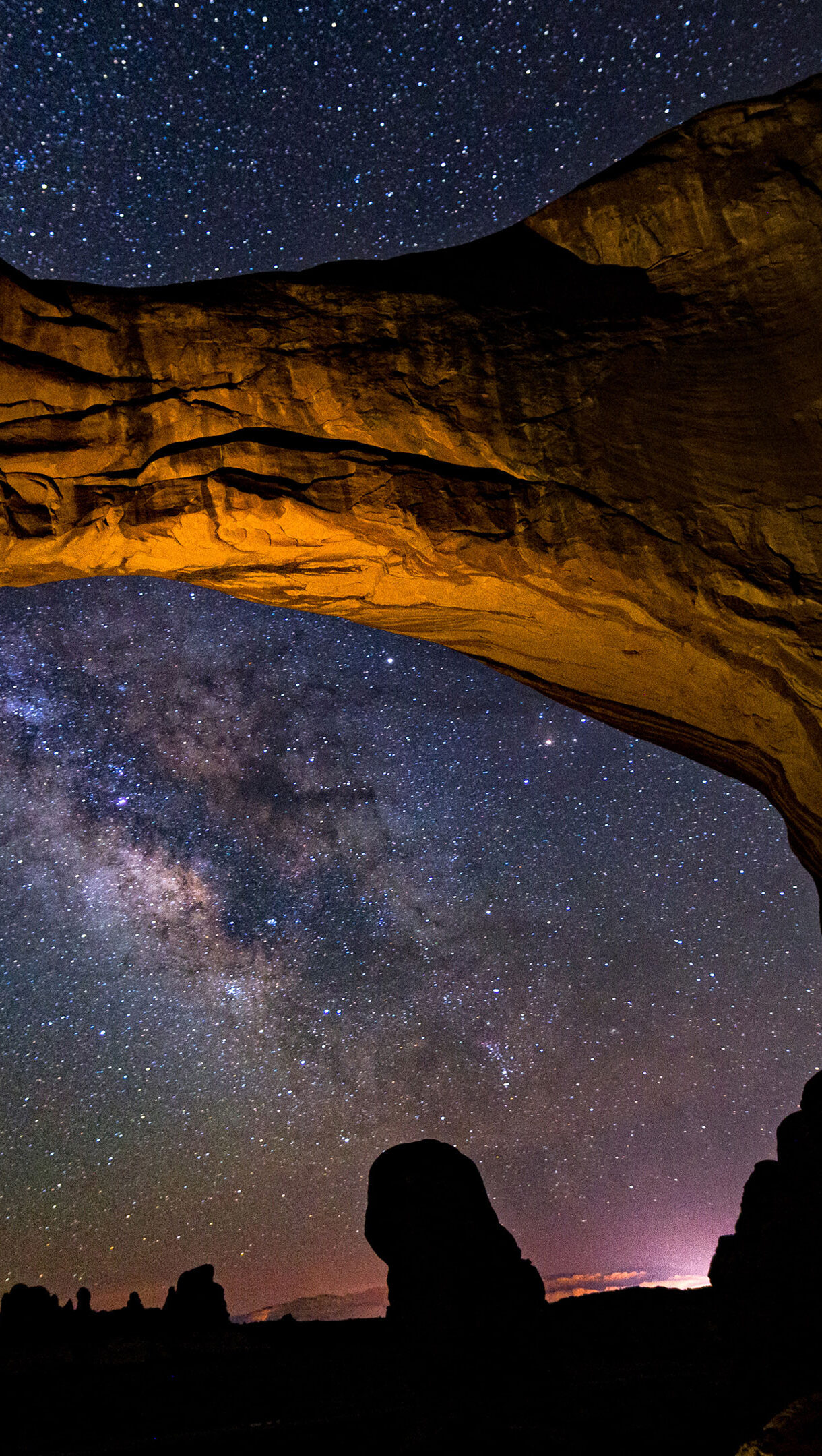 A celestial 4K wallpaper showcases the luminous band of the Milky Way across the vast night sky, perfectly framed by the colossal Double Arch in Arches National Park. The warm, earthy tones of the arch, lit from below, dramatically contrast with the infinite speckled expanse of stars and galactic dust, creating an awe-inspiring vision of the cosmos.