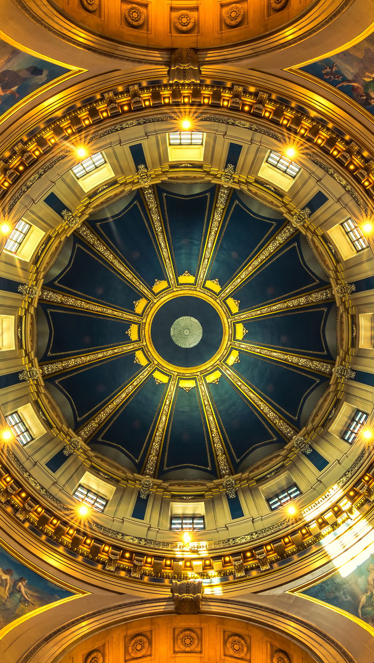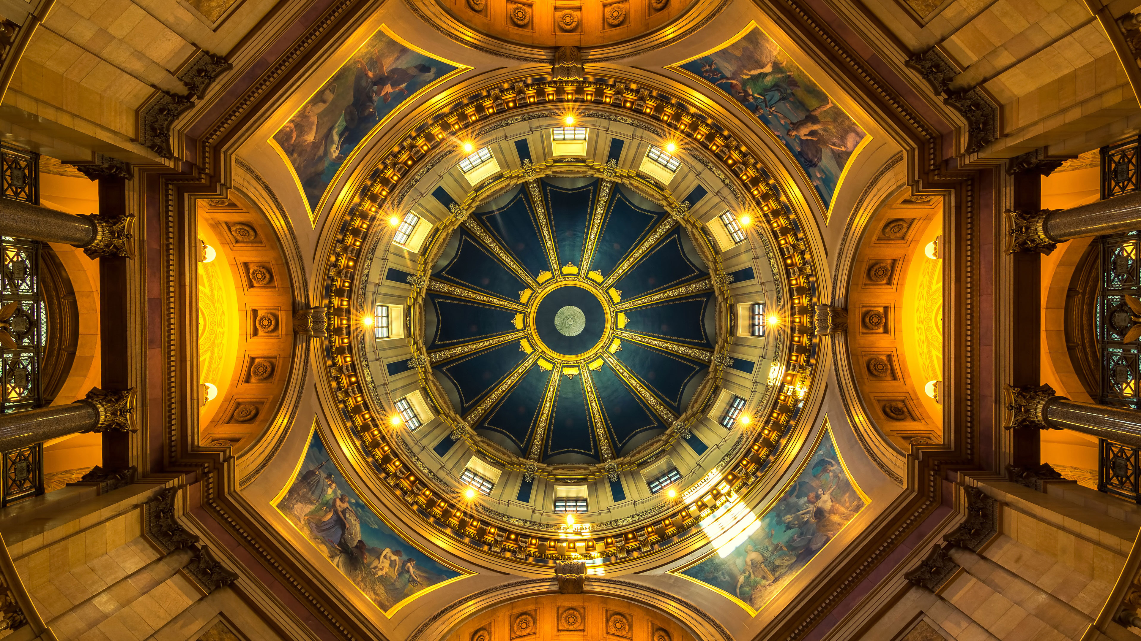 An opulent 4K wallpaper capturing the intricate interior of the Minnesota State Capitol Dome in St Paul, viewed from directly below. Warm golden light bathes the ornate architectural details and vibrant painted murals, radiating outwards from the deep blue central oculus with bright starbursts of light.