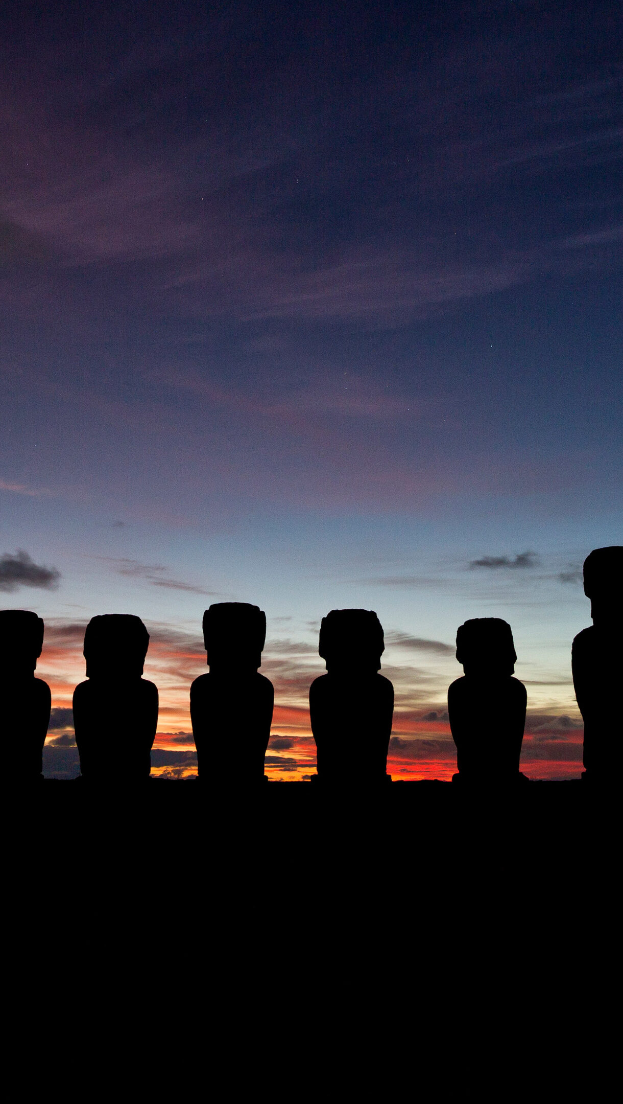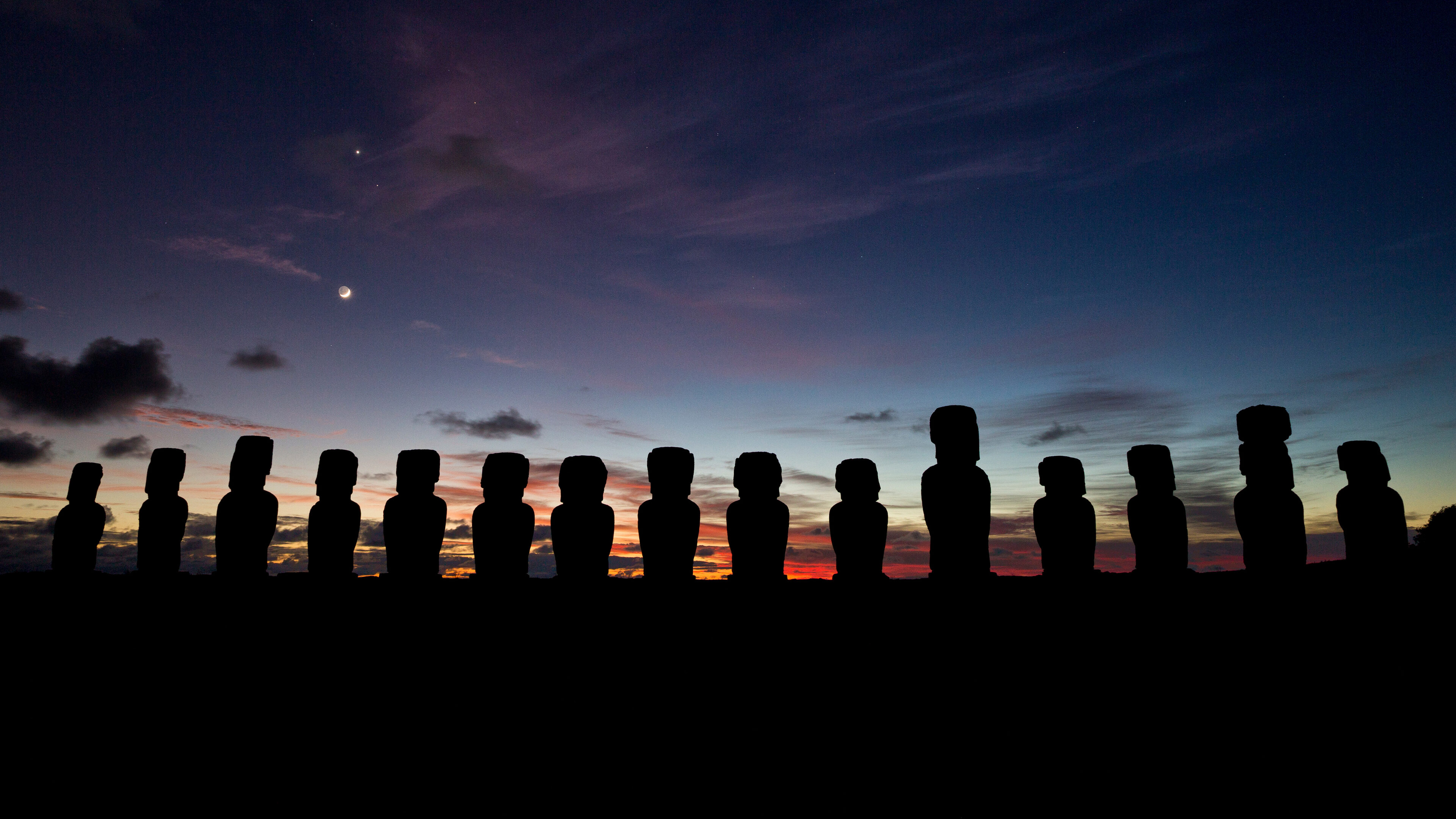 A dramatic 4K wallpaper displaying a row of ancient Moai statues silhouetted against a vibrant sunset sky on Easter Island. A luminous crescent moon and a single bright star punctuate the twilight sky, casting a serene yet mysterious atmosphere over the iconic stone figures.