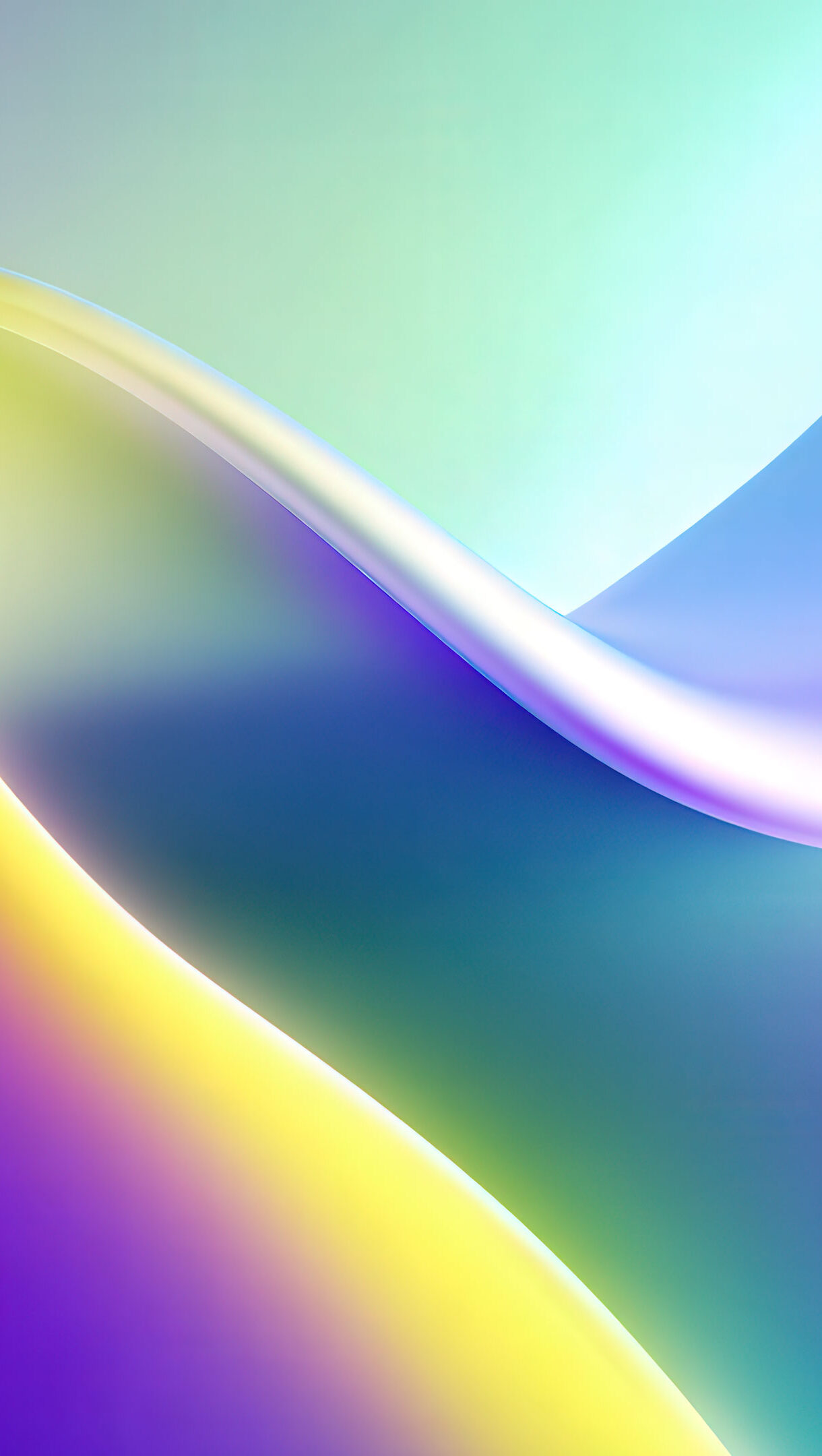 A vibrant 4K wallpaper showcasing a smooth, abstract wave form flowing through a gradient background of cool and warm colors. Bright highlights accentuate the glossy curves, blending purple, yellow, green, and blue in a dynamic and luminous visual flow.