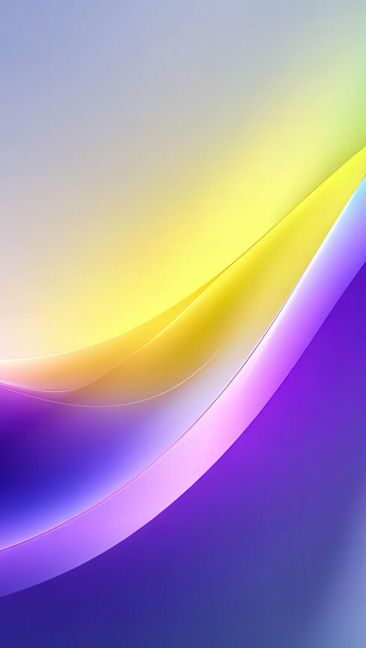 A vibrant 4K wallpaper showcasing abstract flowing waves in a digital gradient landscape. Smoothly blended luminous curves transition through vivid shades of purple, yellow, green, and blue, creating a dynamic yet serene atmosphere.