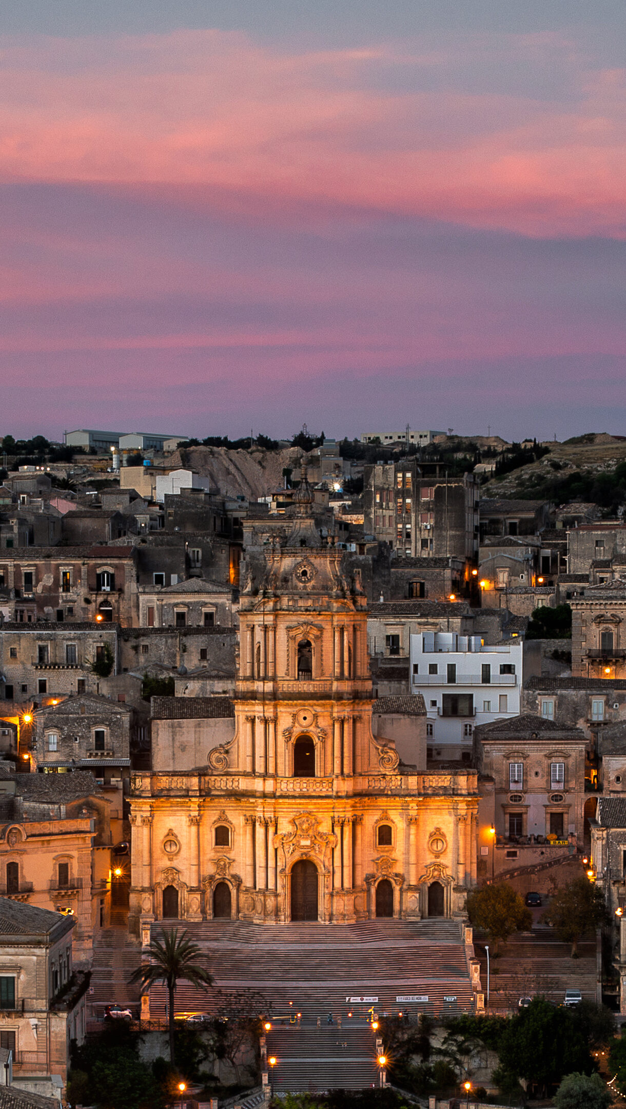 An enchanting 4K wallpaper capturing the historic Modica cityscape in Sicily, Italy, at dusk, centered around a magnificent Baroque church. Warm golden lights from the church and surrounding buildings illuminate the scene, contrasting beautifully with the soft, pastel pink and purple hues of the twilight sky.