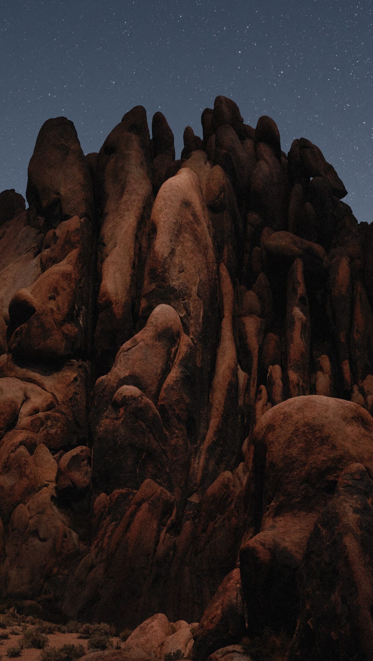 A majestic 4K wallpaper captures towering, rugged rock formations silhouetted against a deep blue night sky in the Mojave Desert, serving as a tranquil macOS backdrop. Thousands of brilliant stars twinkle softly above, creating a serene and expansive celestial canvas that contrasts with the shadowy, textured desert landscape below.