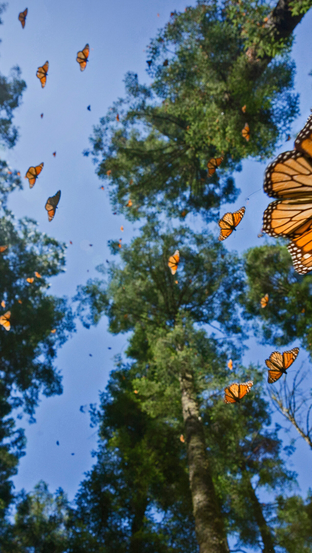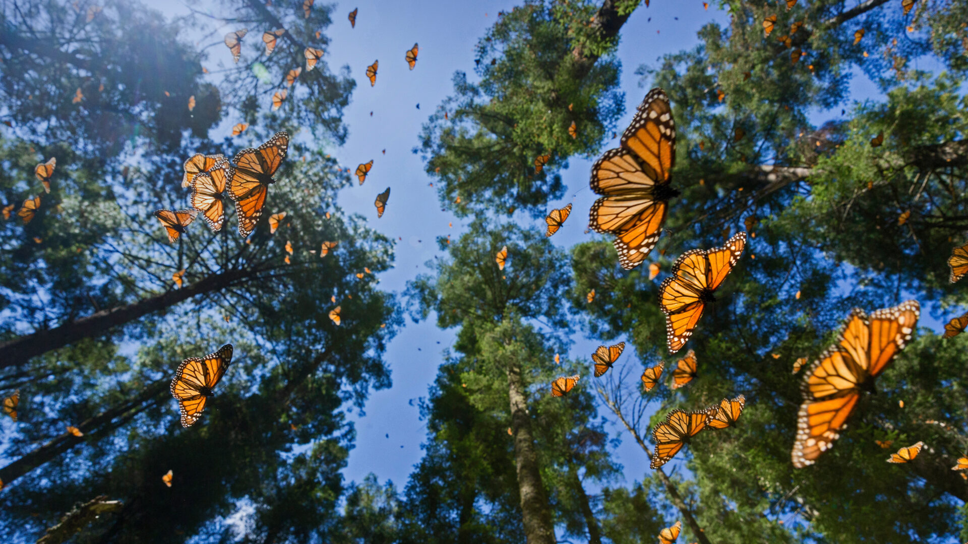 A breathtaking 4K wallpaper displays countless monarch butterflies gracefully soaring amidst the sun-dappled forest canopy of Angangueo, Mexico. Their vibrant orange wings, highlighted by streaks of sunlight, create a mesmerizing spectacle against the clear blue sky and rich green trees, evoking a sense of magnificent natural migration.