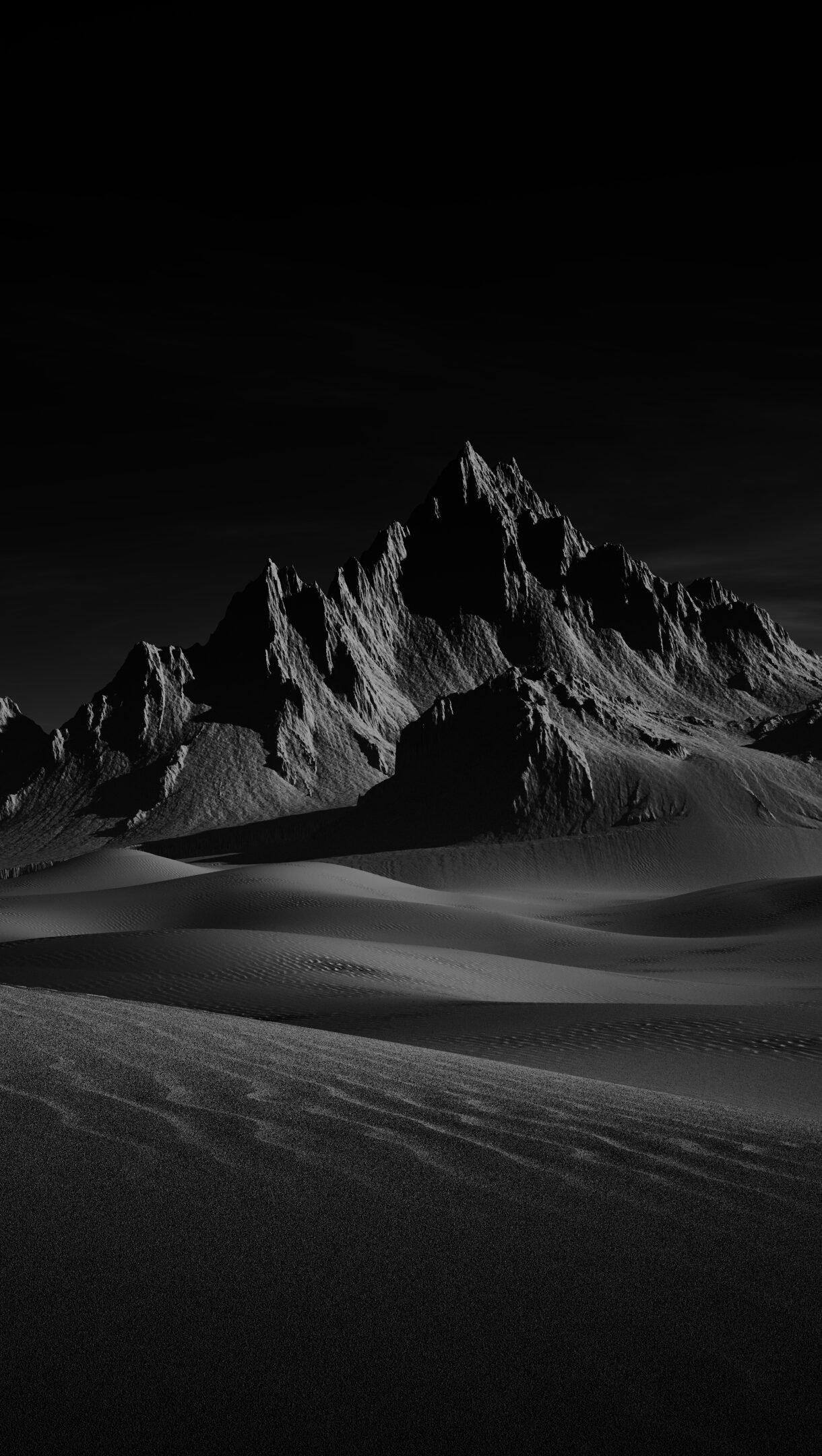 An expansive 4K wallpaper captures a majestic, jagged mountain rising dramatically from vast, undulating sand dunes under a brooding, monochrome sky. The stark interplay of light and shadow across the sculpted peaks and flowing dunes, characteristic of exquisite digital art, emphasizes the desolate beauty and profound depth of the landscape.