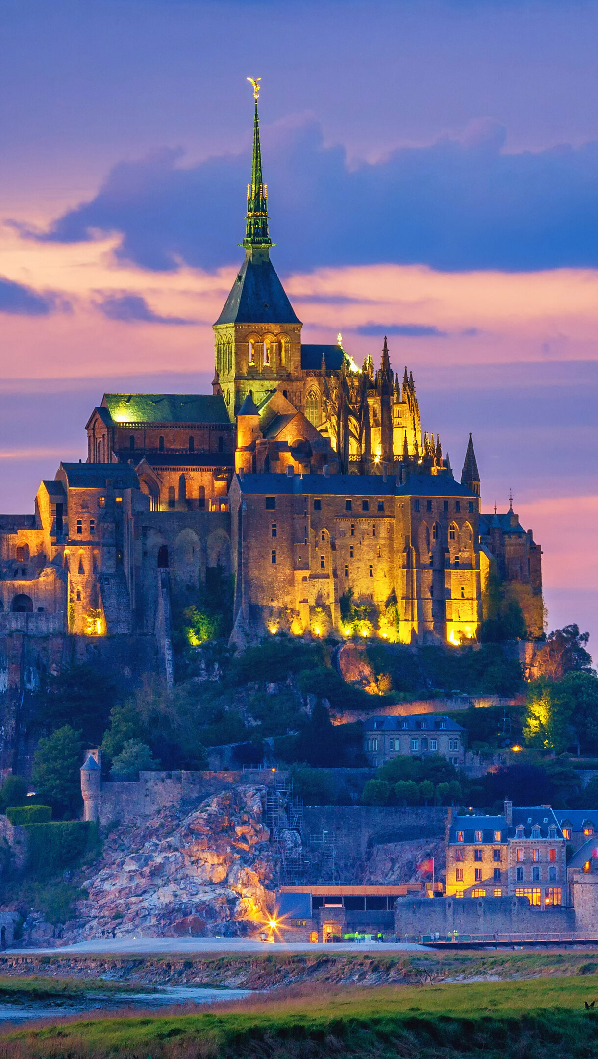 A captivating 4K wallpaper of Mont-Saint-Michel Island in Normandy, France, appearing as a medieval fortress and abbey illuminated at twilight. The golden glow of the complex stands majestically against a sky painted with soft gradients of purple, pink, and deep blue, creating an ethereal and serene landscape.