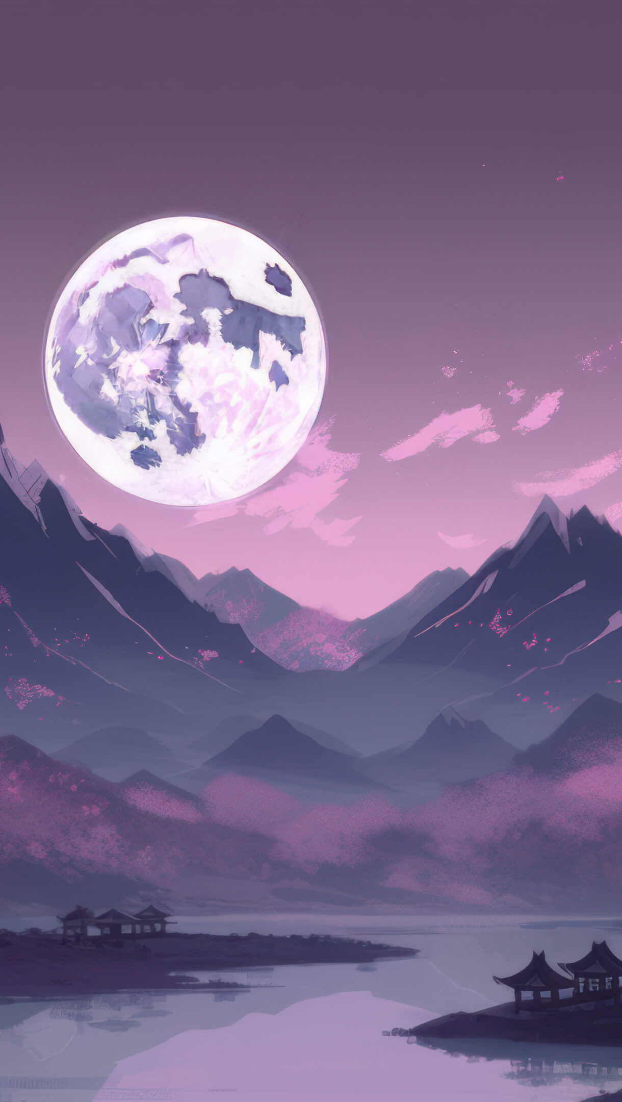 A mesmerizing 4k wallpaper featuring a stunning Japanese painting of mountains, trees, and a serene moonlit scene. The artwork's purple hues create a captivating atmosphere, while the AI-generated details add a touch of modernity.