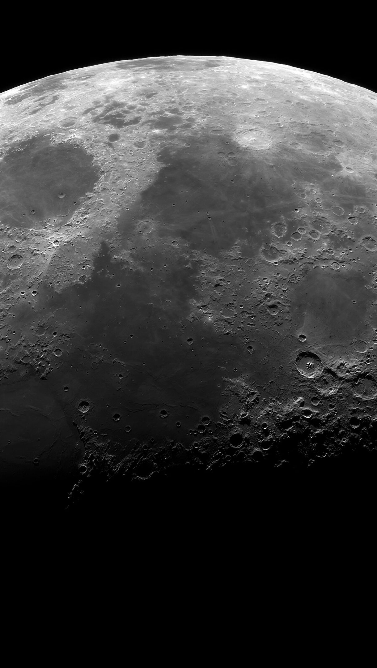 An awe-inspiring 4K wallpaper capturing the heavily cratered surface of the Moon set against the infinite blackness of space. The stark contrast between sunlit peaks and deep shadows dramatically highlights the rugged lunar landscape, conveying a profound sense of ancient desolation.