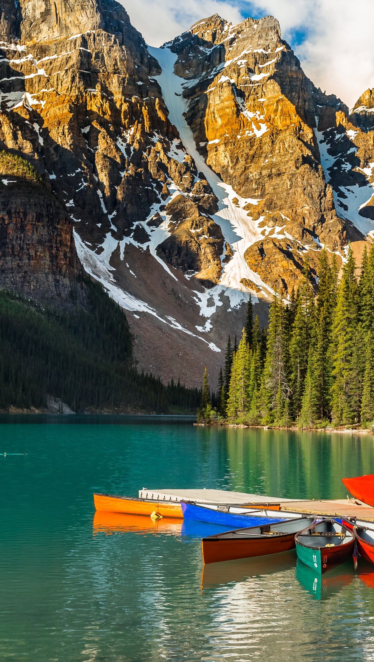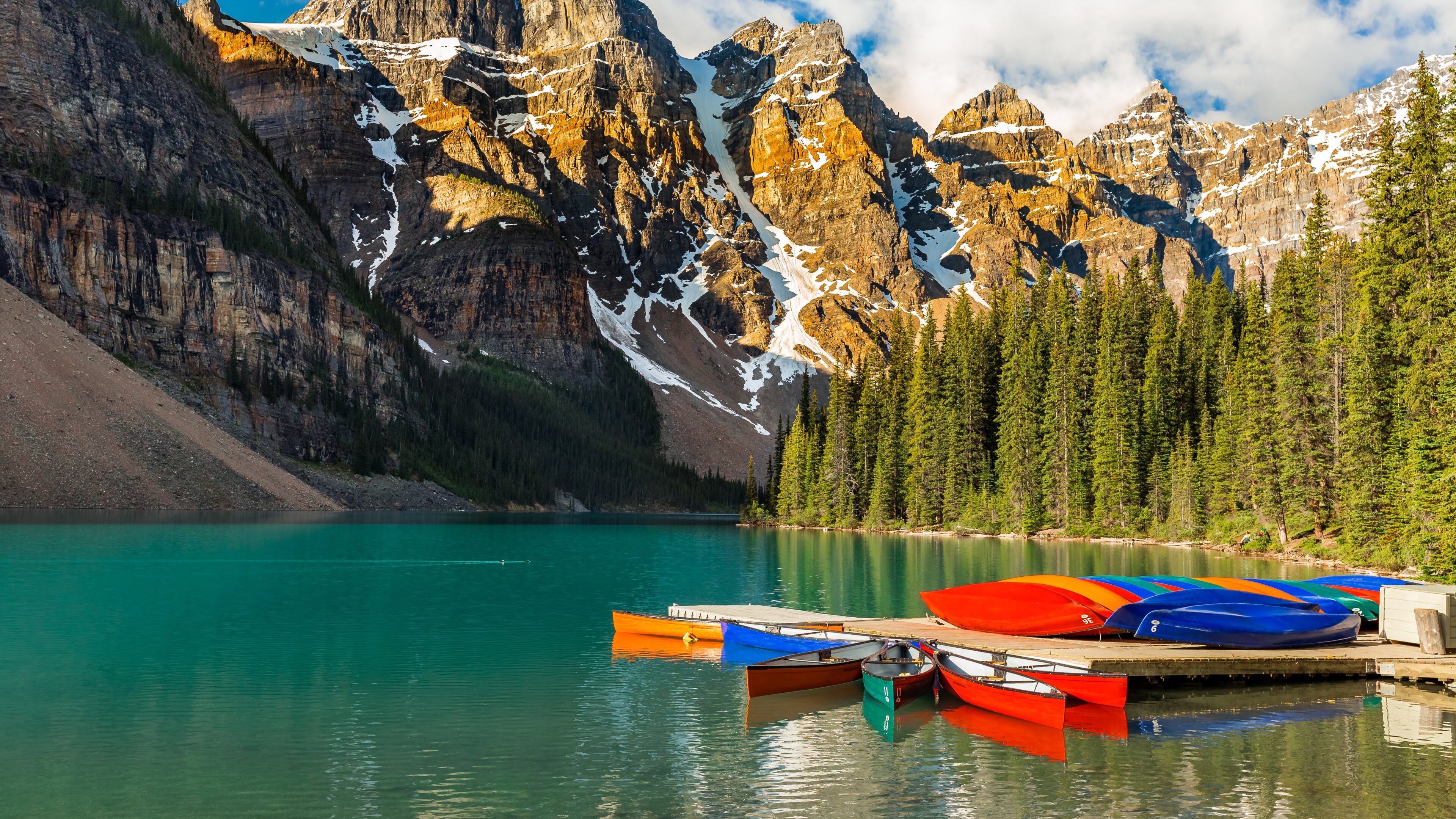 Experience the serene beauty of Moraine Lake in Banff National Park, Canada, with this 4K wallpaper featuring boats on the tranquil turquoise waters. Capturing the picturesque landscape, it showcases the iconic beauty of Moraine Lake in high resolution. Simply click the download button to bring this masterpiece to life on your screen as a desktop wallpaper or save it for later in your picture collection.