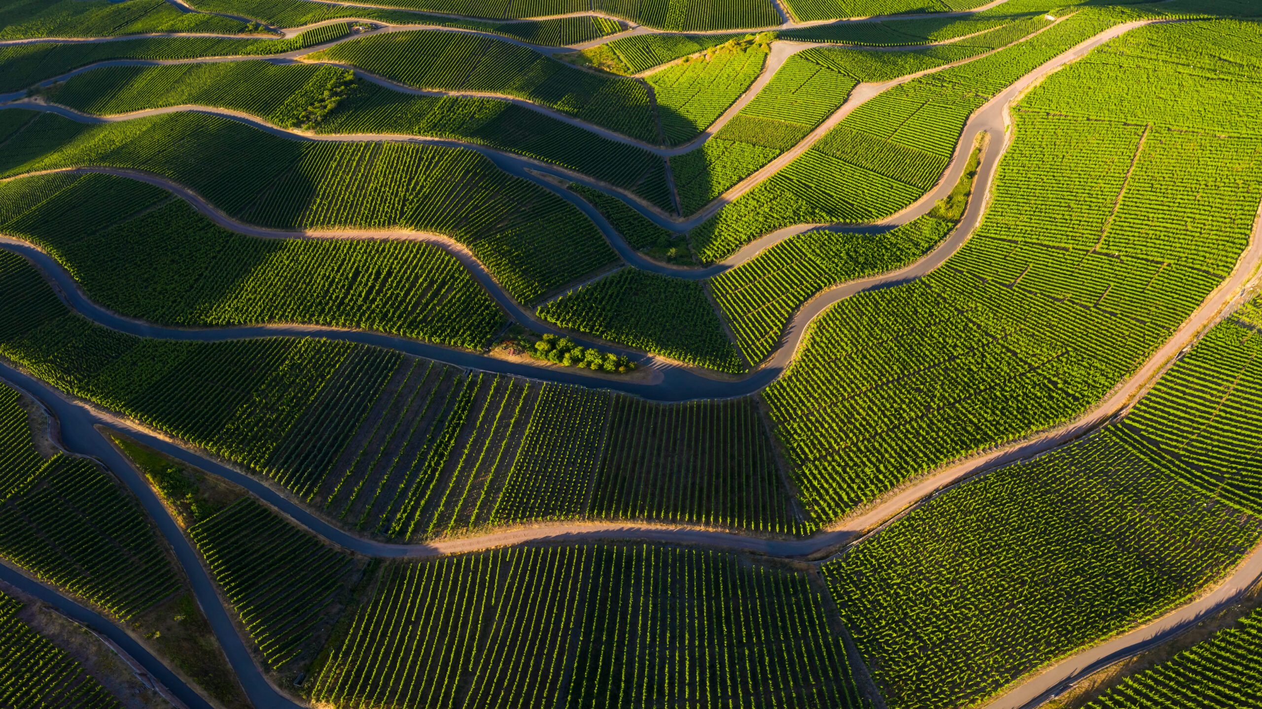 A breathtaking 4K wallpaper showcases the Mosel Valley vineyards, with an aerial view revealing meticulously organized green rows and numerous winding roads. Sunlight beautifully illuminates the terraced rows and serpentine paths, casting dramatic shadows that accentuate the landscape's undulating patterns and vibrant hues.