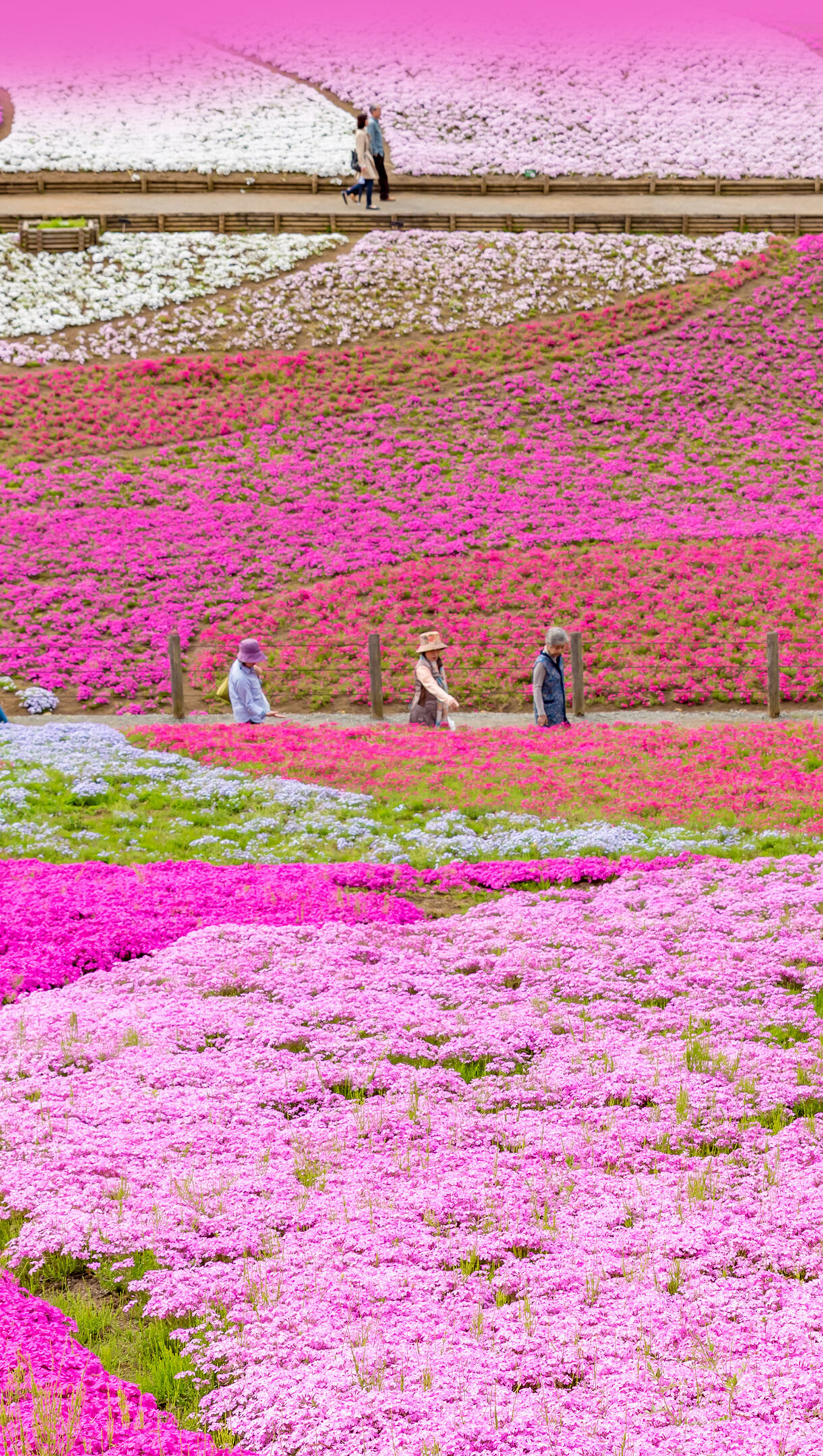 A mesmerizing 4K wallpaper showcases the expansive Moss Pink flower fields of Hitsujiyama Park, Saitama, Japan, where visitors wander along winding paths through the colorful landscape. Brilliant hues of fuchsia, soft pink, and white moss phlox form striking, undulating patterns across the terrain, creating a vibrant and enchanting spring spectacle.