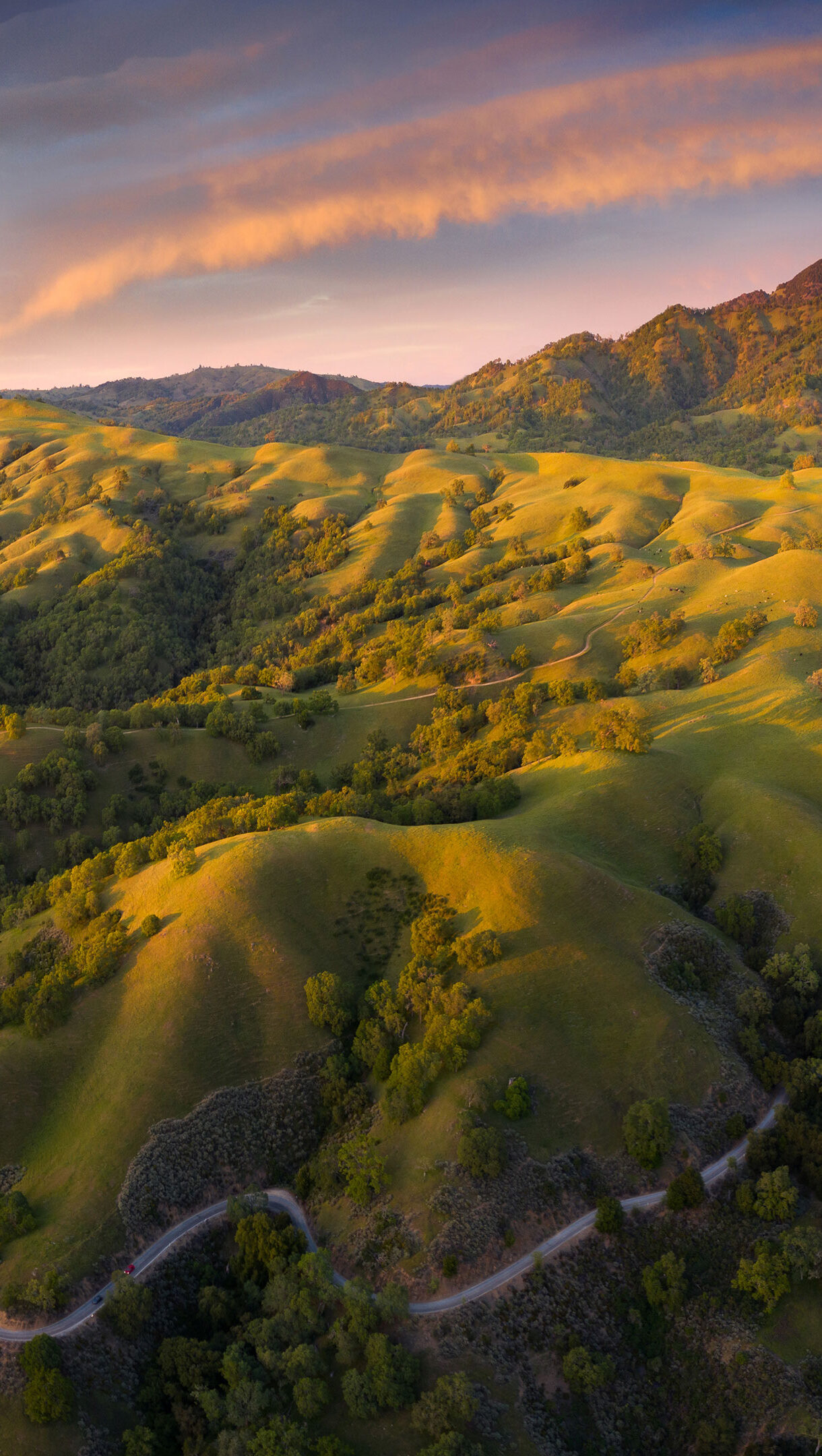 A majestic 4K wallpaper featuring Mount Hamilton and its expansive rolling hills at sunset near San Jose. Golden light illuminates the vibrant green slopes, casting long shadows and enhancing the serene beauty under a warm, colorful sky.