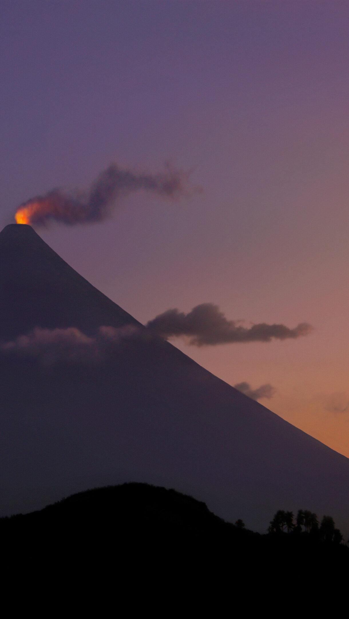 A captivating 4K wallpaper showcasing Mount Mayon Volcano in the Philippines during a stunning sunset. The volcano's glowing crater emits a vibrant orange light and smoke plume, set against a magnificent sky that fades from deep purple to warm orange.