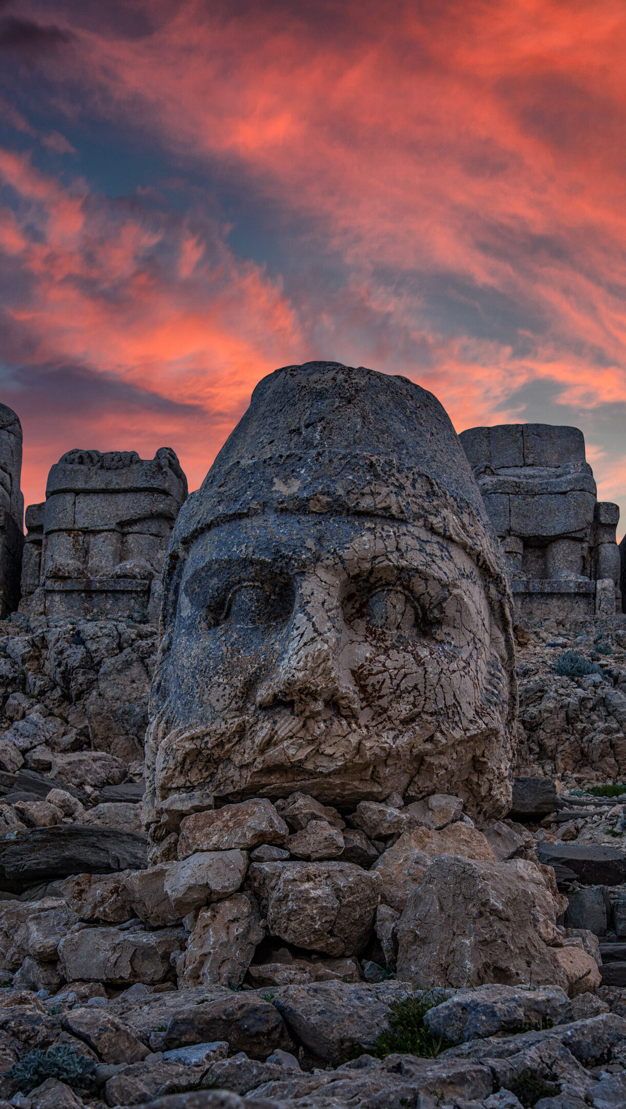 A majestic 4K wallpaper featuring ancient limestone statues, including a large decapitated head, scattered across the rocky summit of Mount Nemrut in Adıyaman, Turkey. The breathtaking sunset paints the sky with fiery oranges and deep purples, creating a dramatic contrast that highlights the ancient stone textures and evokes a sense of timeless grandeur.