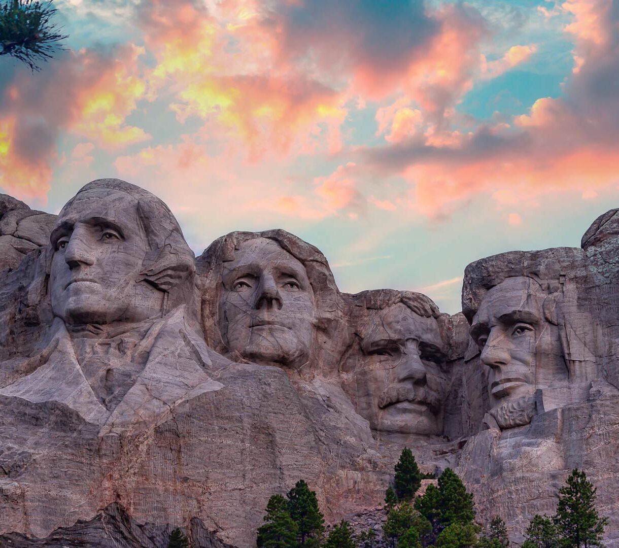 A breathtaking 4K wallpaper showcasing the iconic Mount Rushmore National Memorial in South Dakota at sunset. The colossal stone carvings of the four presidents are dramatically silhouetted against a vibrant sky painted with brilliant pink, orange, and blue clouds, evoking a majestic and patriotic mood.