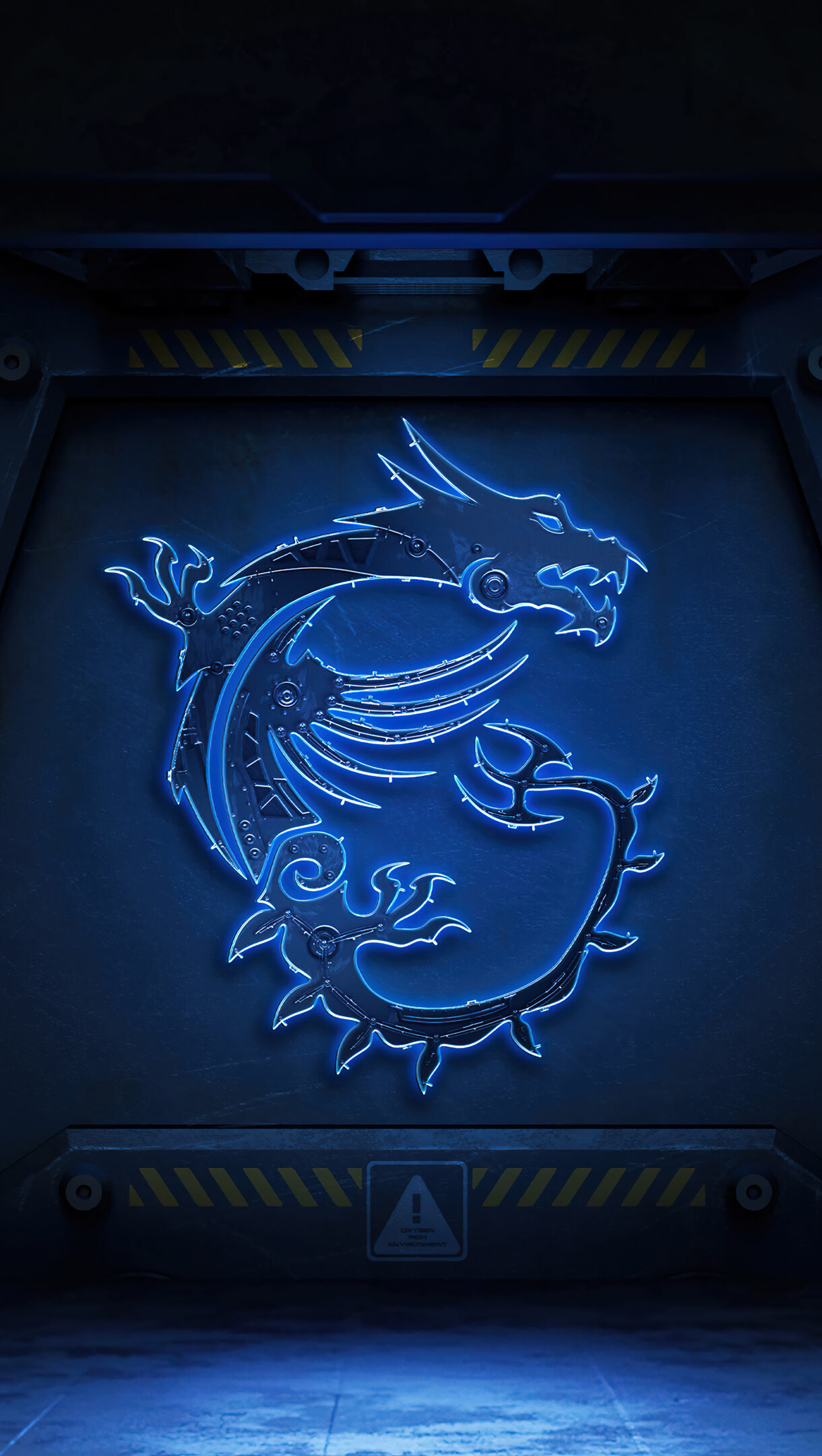 A captivating 4K wallpaper presenting the iconic MSI blue neon dragon gaming logo displayed prominently within a dark, futuristic metallic chamber. Its intense blue glow powerfully illuminates the surrounding dark, textured surfaces, creating an immersive, high-tech gaming atmosphere.