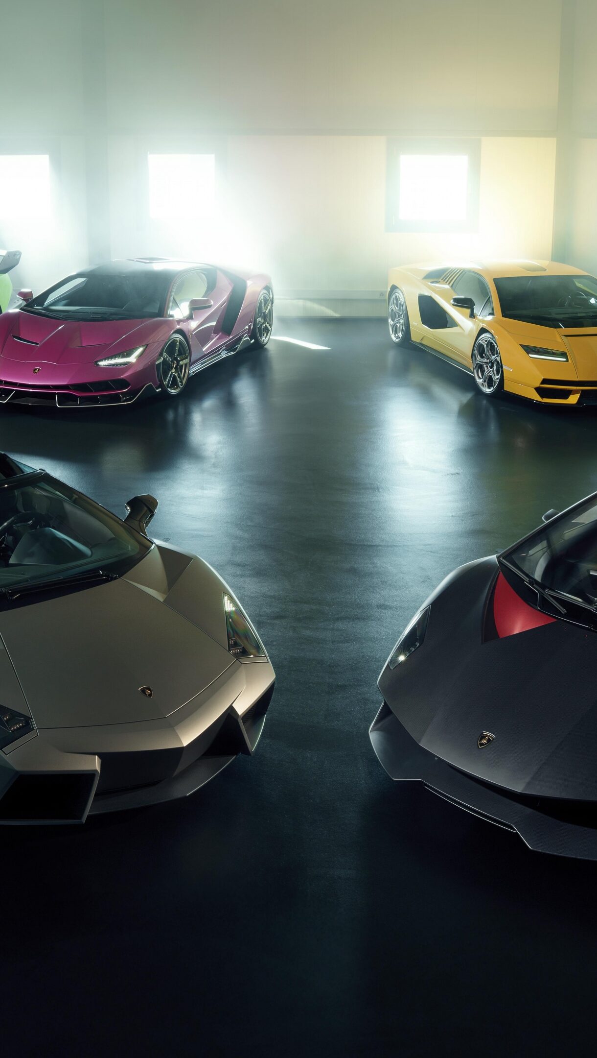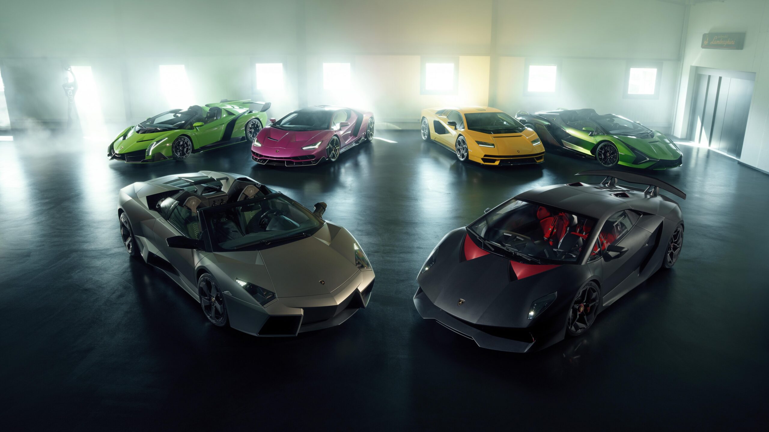 This striking 4K wallpaper captures multiple colorful Lamborghini cars dramatically displayed in a sleek, bright showroom. Bright, hazy light from overhead and windows illuminates their vibrant paintwork and sharp lines, creating a luxurious and powerful ambiance.