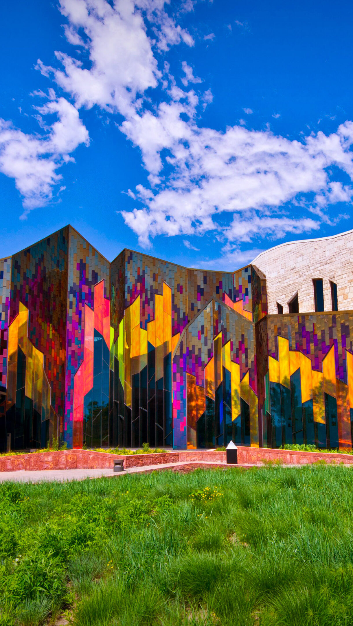 A vibrant 4K wallpaper showcasing the Museum at Prairiefire in Overland Park, Kansas, set against a bright blue sky with scattered clouds and a lush green foreground. Its contemporary architecture features a striking, multi-faceted facade composed of a dynamic mosaic of brilliant reds, purples, oranges, and blues, contrasting with the building's textured, light-colored stone sections.