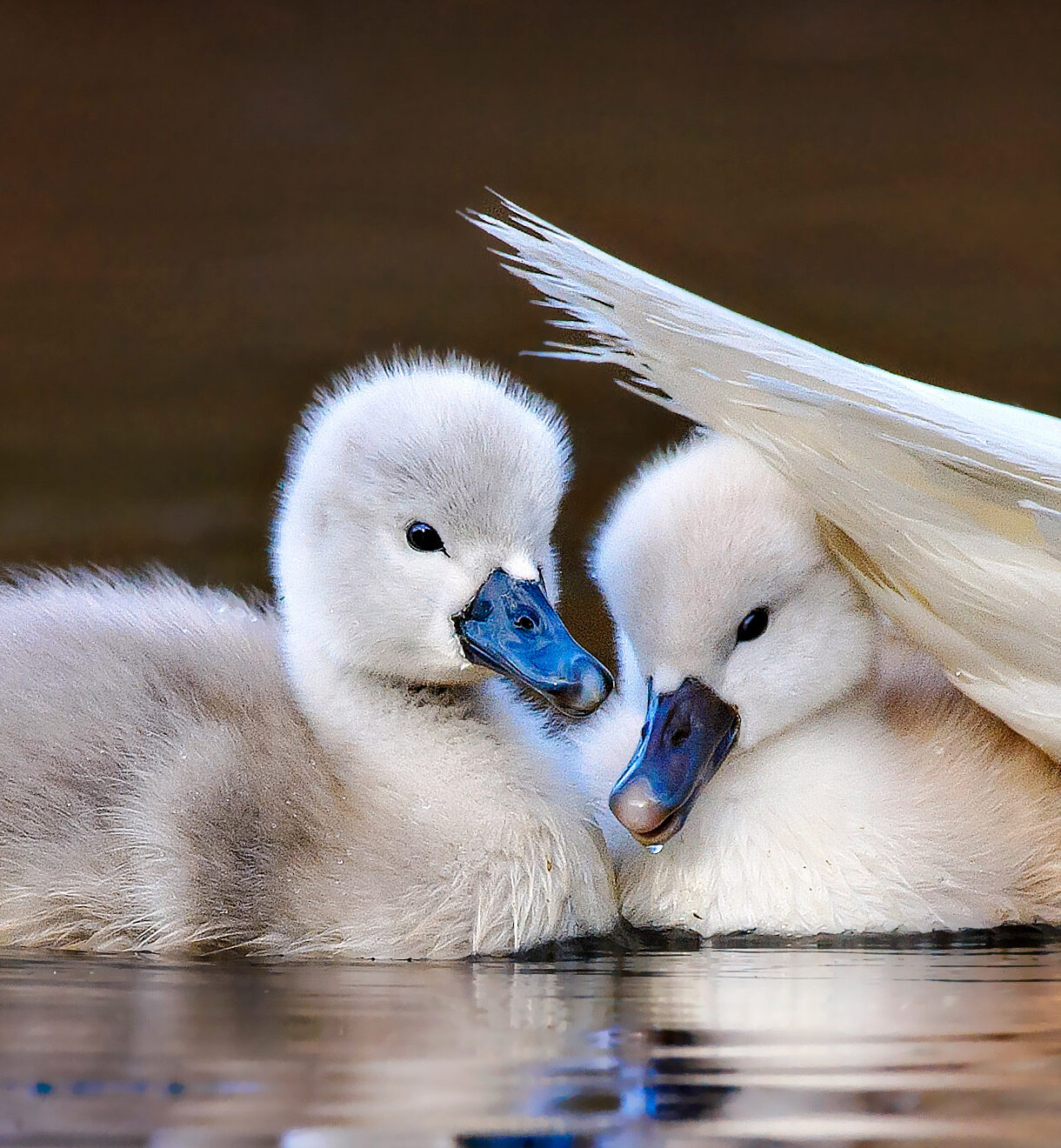 A heartwarming 4K wallpaper illustrating two fluffy Mute Swan chicks nestled safely under their mother's white tail feathers on the water at Massapequa Preserve, Long Island. Their delicate gray down and bright blue beaks contrast beautifully with the crisp white feathers and the deep, reflective water, conveying a sense of profound security and tenderness.