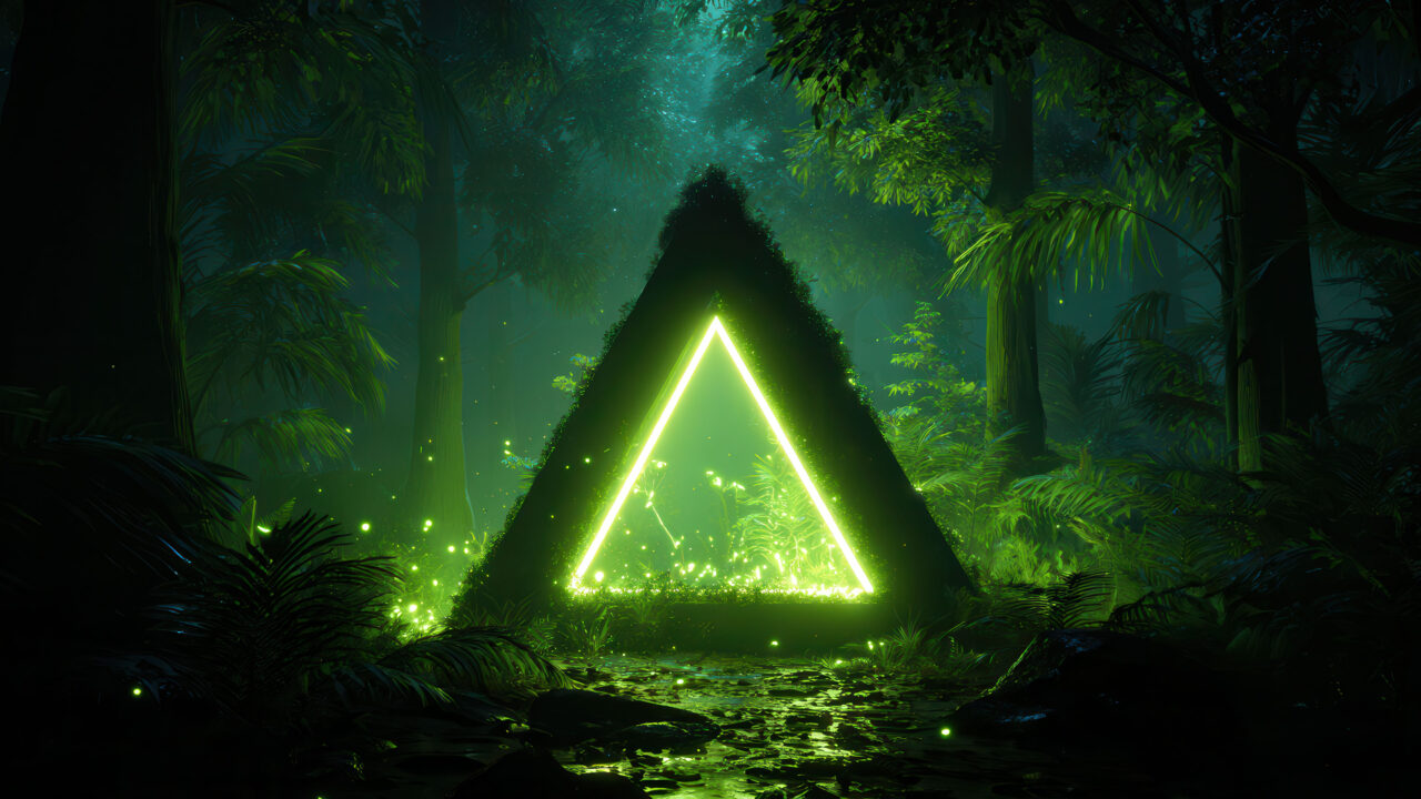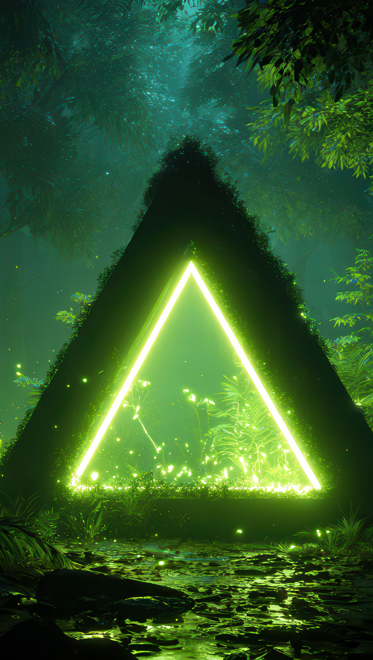 A mystical 4K wallpaper presenting a large, glowing lime-green triangle outline standing on wet ground in a dark, deep forest. The bright geometric light contrasts sharply with the organic shadows of the trees and leaves, while scattering glowing particles enhance the eerie, magical atmosphere.