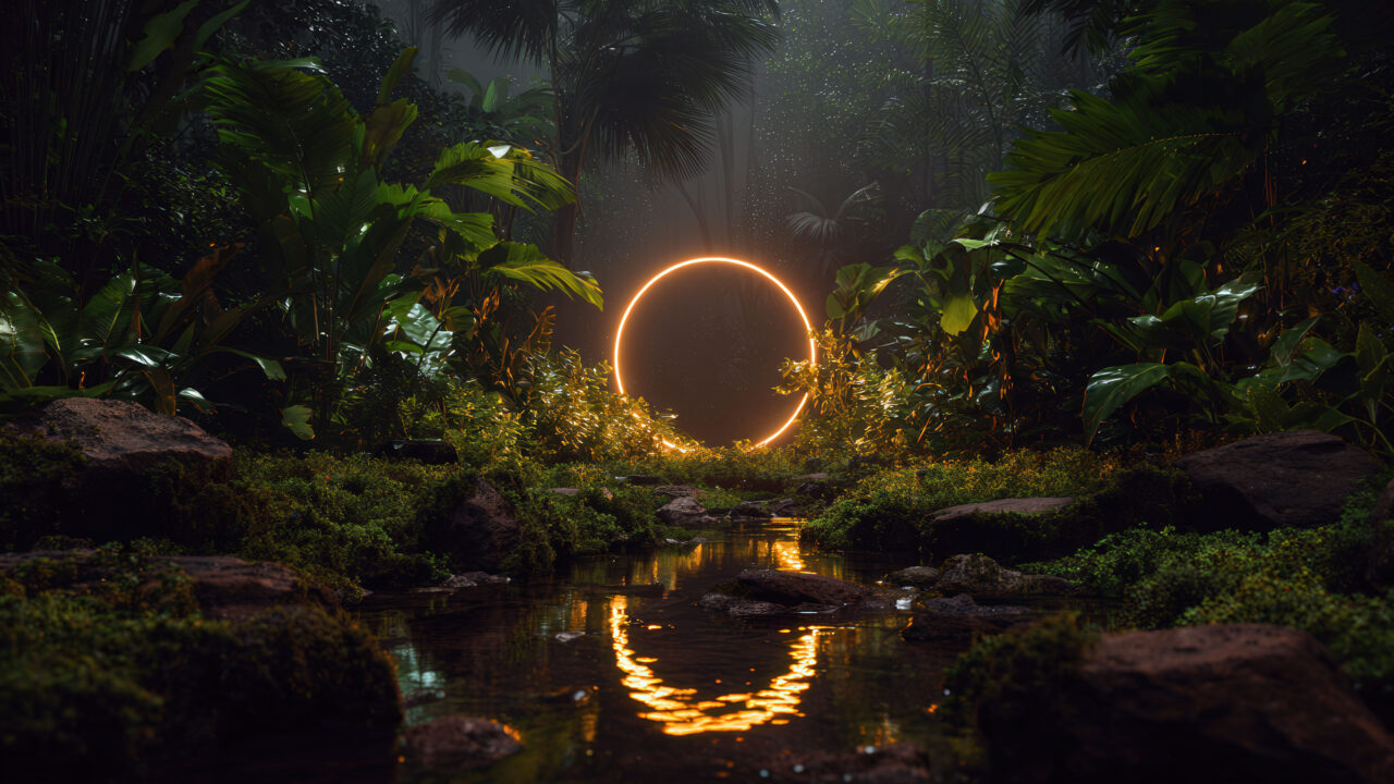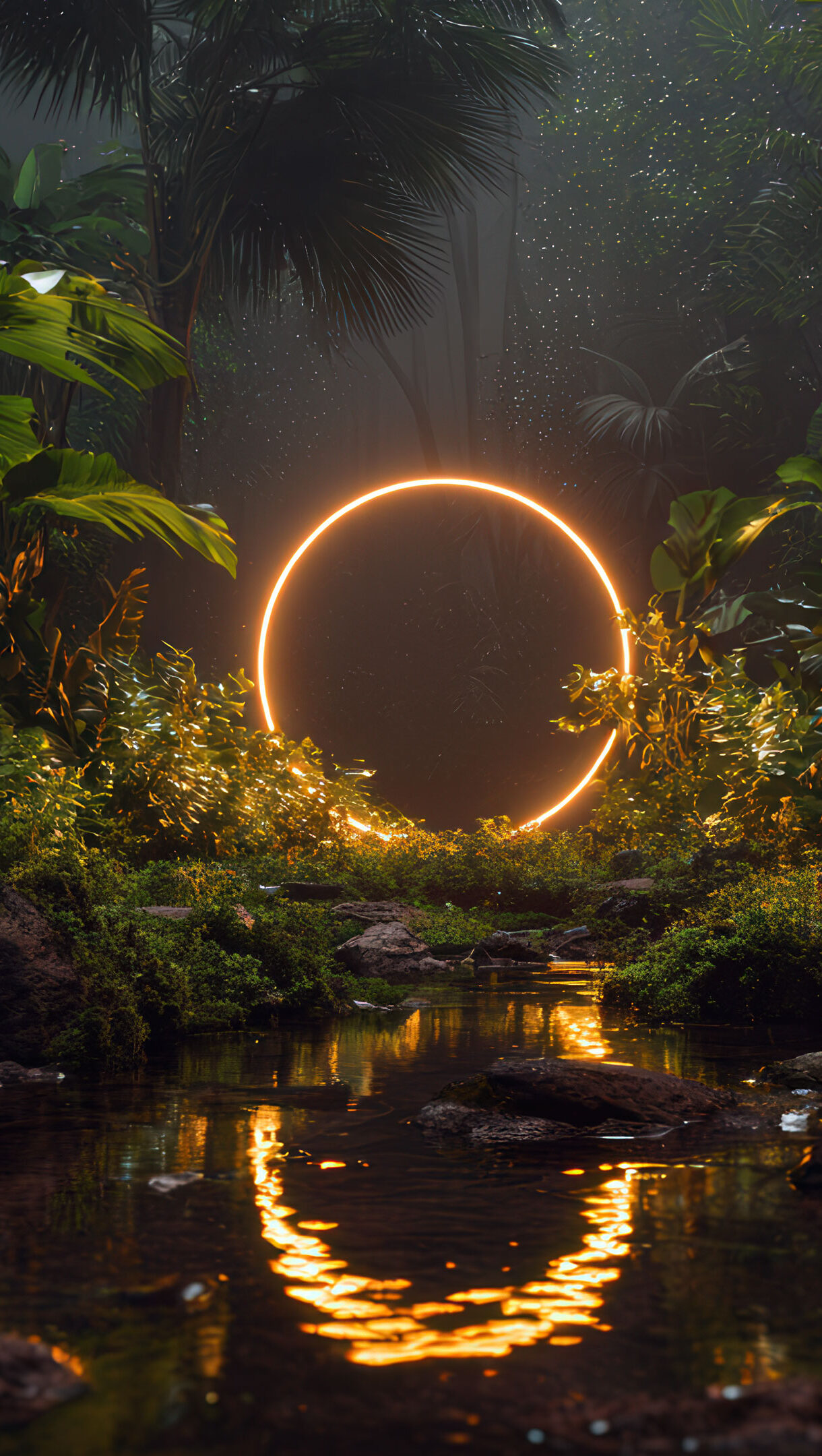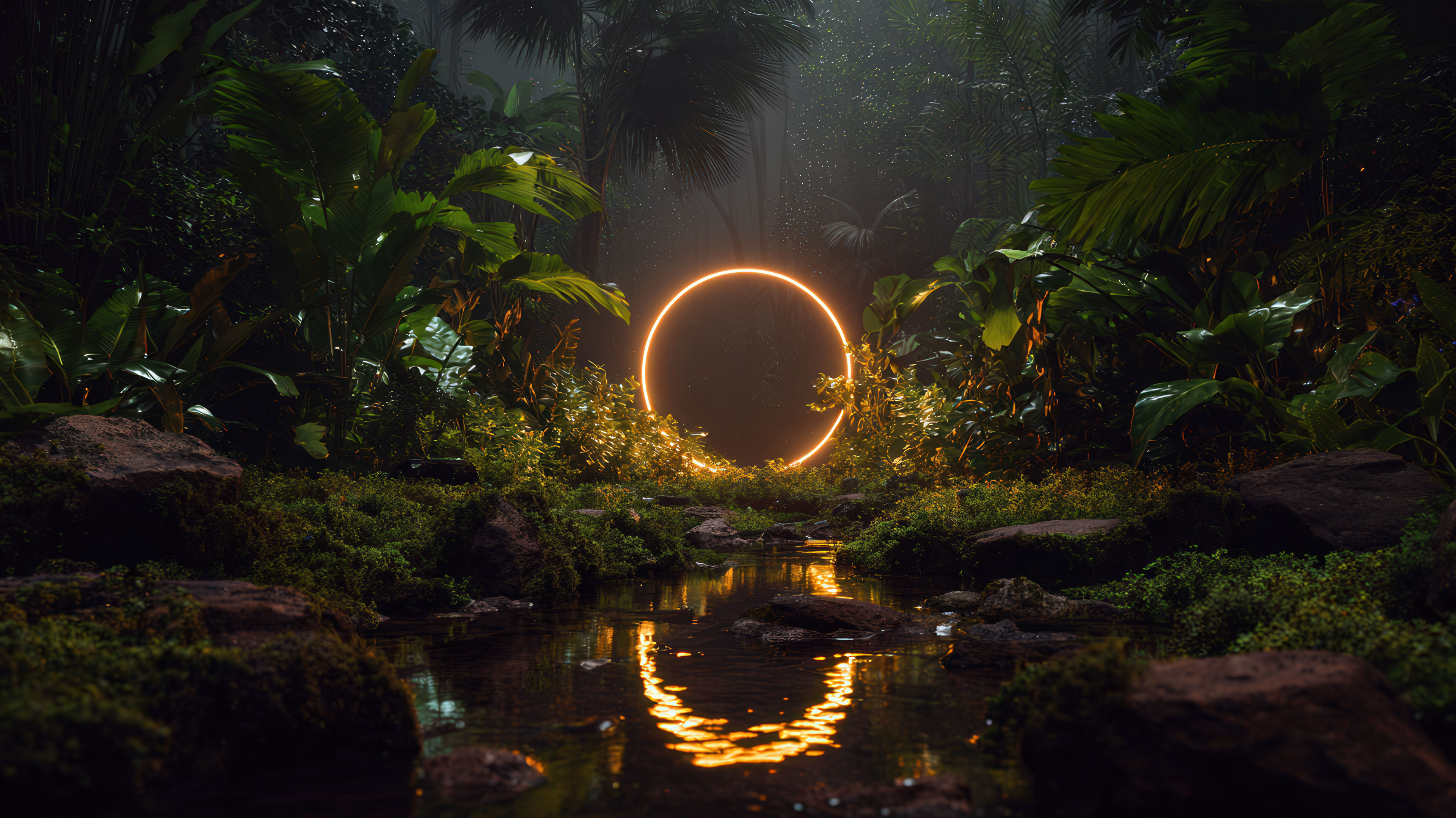 A stunning 4K wallpaper featuring a glowing golden ring suspended in the heart of a lush jungle. Surrounded by dense tropical foliage and misty air, the ring casts a warm, mystical light that reflects off a tranquil stream below, creating a surreal and enchanting atmosphere deep within nature.