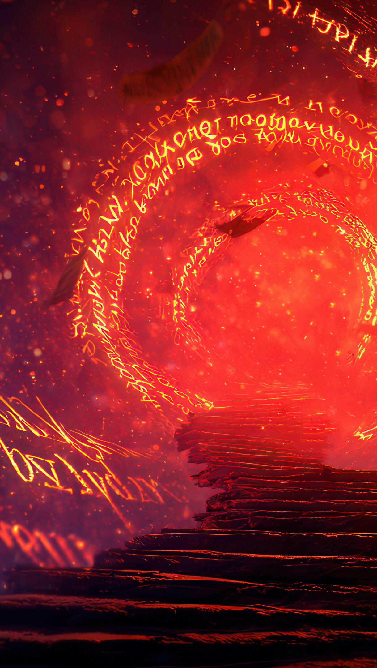 An otherworldly 4K wallpaper depicting dark, jagged stairs leading into a vast, mystical realm dominated by a swirling vortex of glowing red and orange energy. Intricate golden runes radiate from within the fiery tunnel, casting shimmering light onto scattered ancient papers and ethereal particles, creating an intense, magical atmosphere.