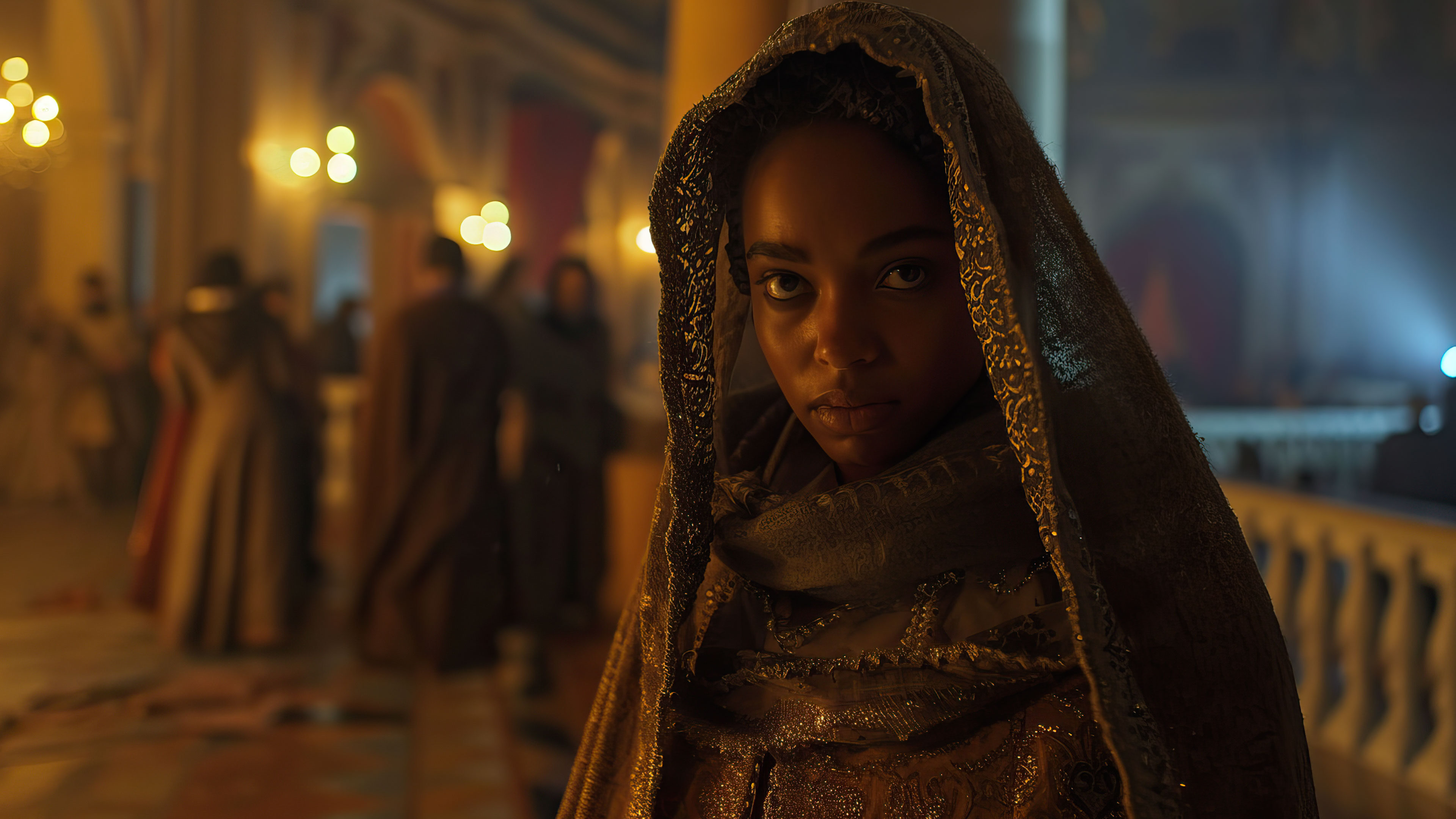 A mesmerizing 4K wallpaper captures the essence of a mystical evening in a grand ballroom, where ethereal lights dance gracefully, casting enchanting shadows. The scene exudes an air of elegance and magic, making it a captivating choice for your desktop or mobile wallpaper.
