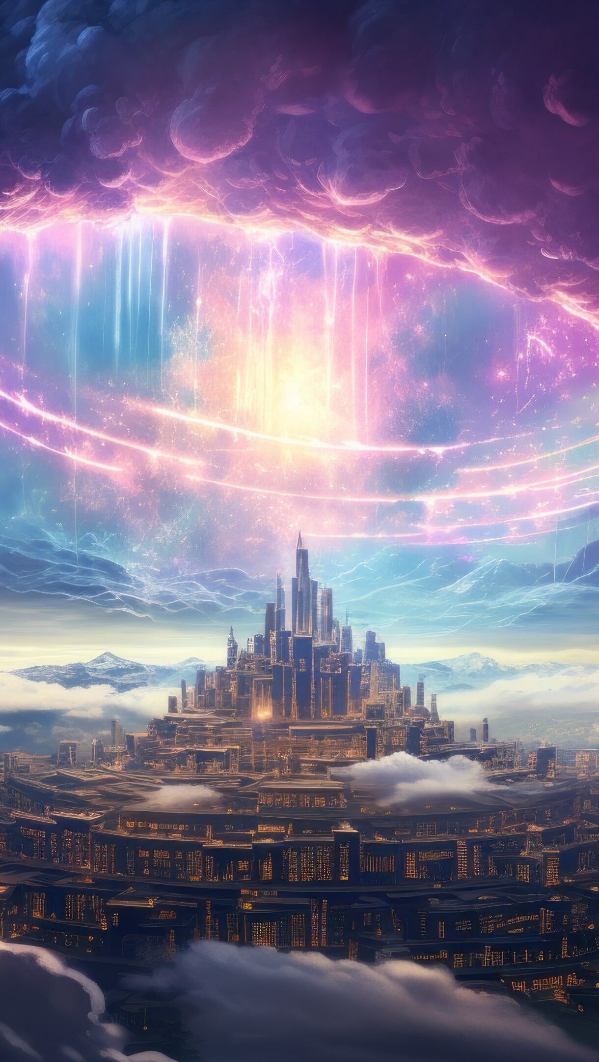 An enchanting 4K wallpaper showcasing an AI-generated mystical city floating above a sea of clouds. The ethereal cityscape against a serene sky creates a captivating and surreal visual experience, perfect for desktop or mobile wallpapers. Simply click the download button to bring this masterpiece to life on your screen as a desktop wallpaper or save it for later in your wallpaper collection.