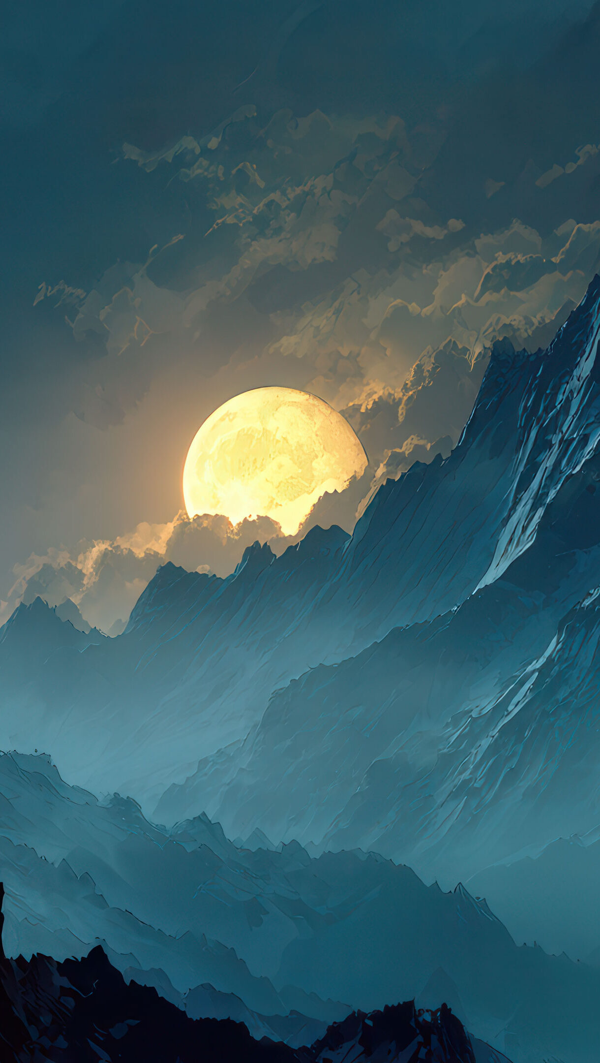 A mesmerizing 4K wallpaper featuring a large, brilliant full moon dominating a vast, misty mountain range under a twilight sky. The moon's intense golden glow casts a radiant light on the ethereal clouds and illuminates the rugged, snow-dusted peaks, evoking a sense of tranquil grandeur.