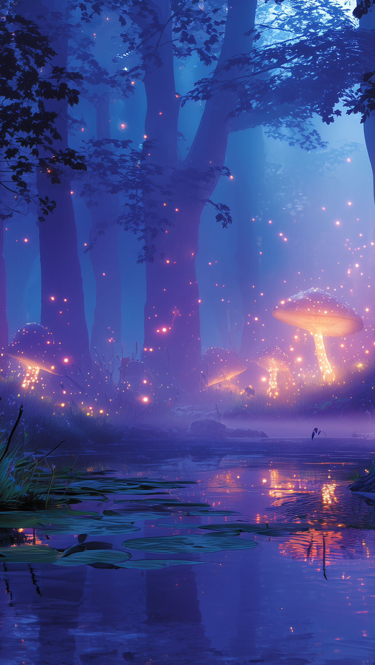 A mystical night forest scene illuminated by an ethereal glow. Luminous mushrooms and sparkling fireflies cast a warm, enchanting light on the trees and the reflective surface of a calm stream.