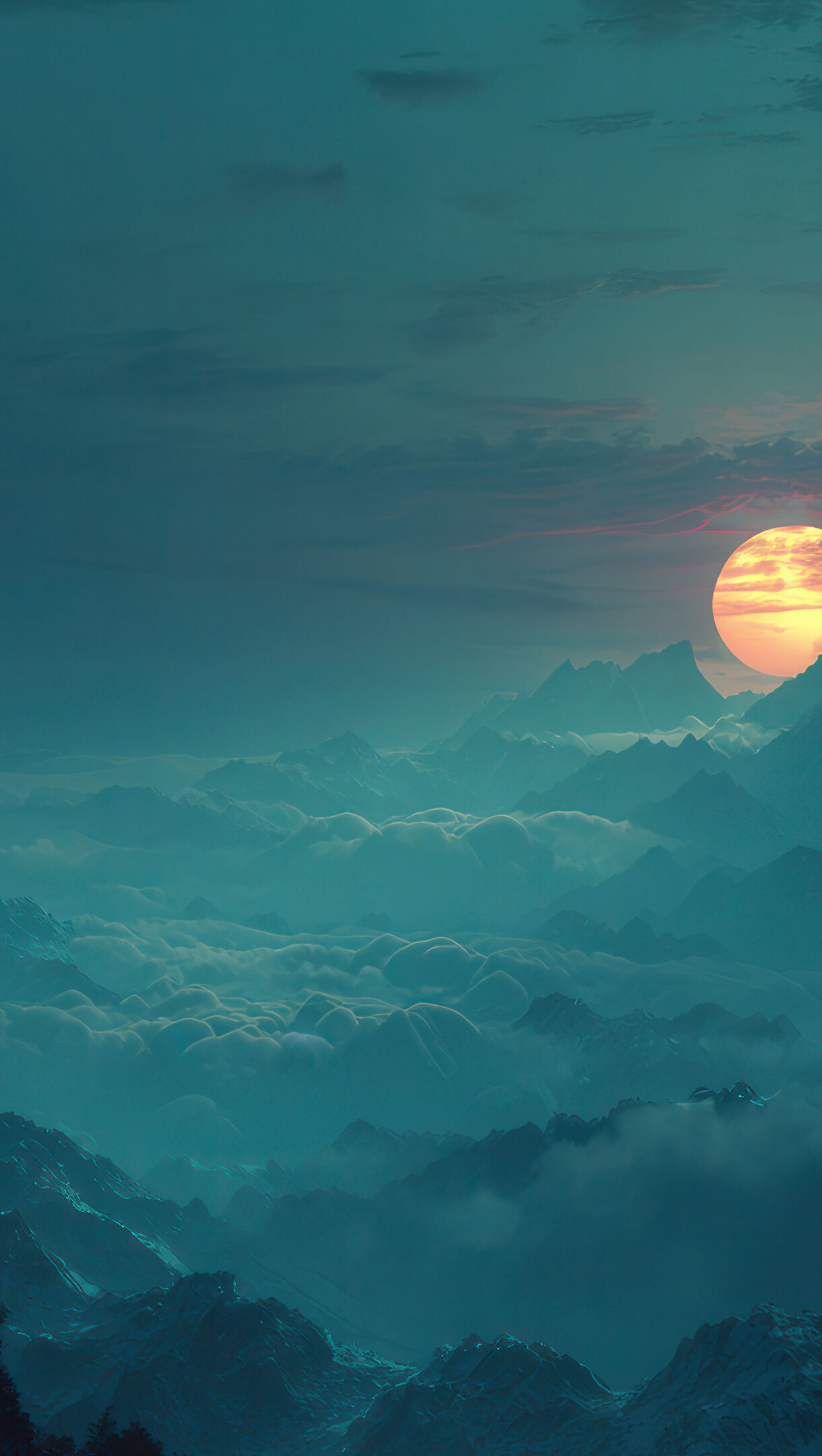 A mesmerizing 4K wallpaper of a vast range of jagged, teal-hued mountains shrouded in low-lying clouds or mist, stretching under a dark, twilight sky. A colossal, vibrant golden sun glows intensely behind a central peak, casting warm light that dramatically contrasts with the cool, ethereal blues and greens of the misty landscape, creating a sense of mystical grandeur.