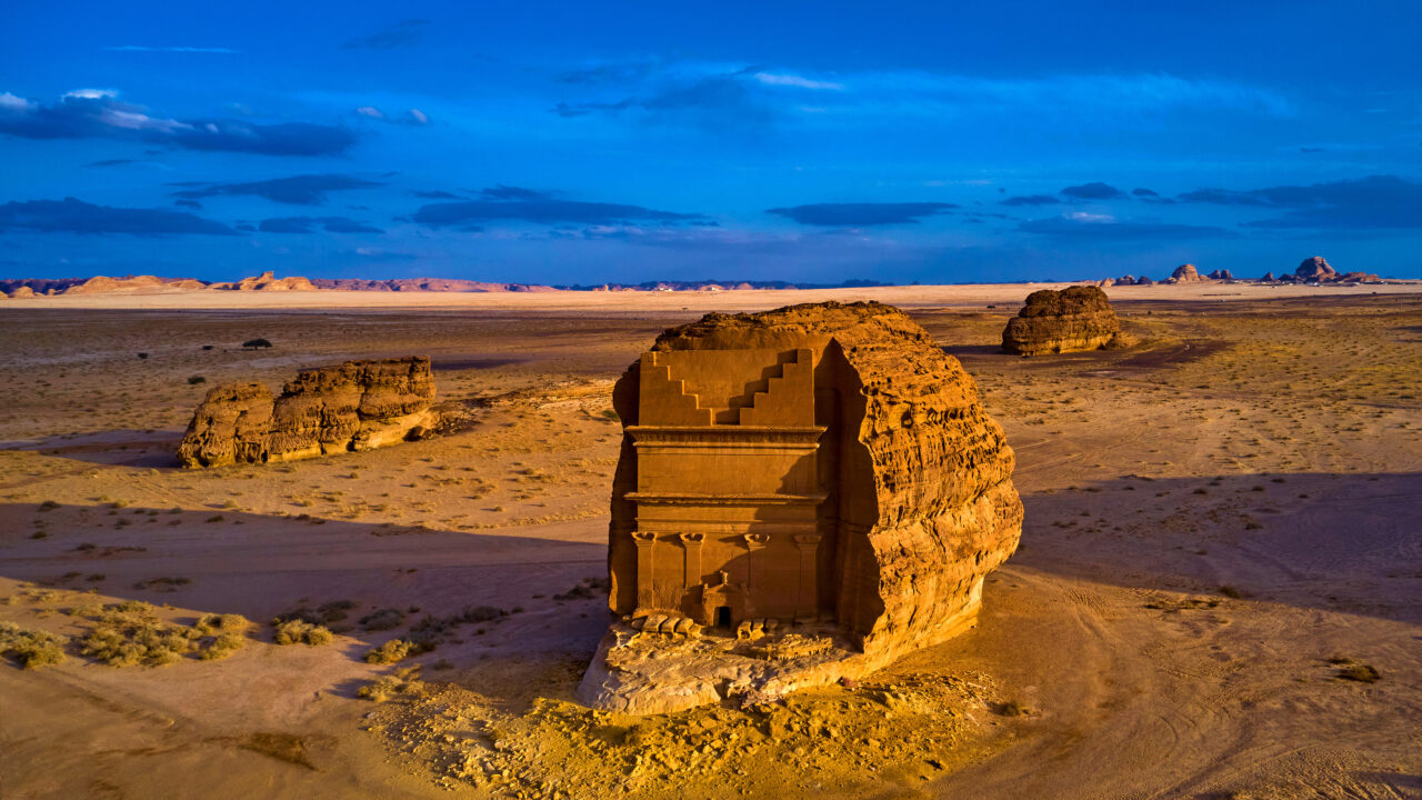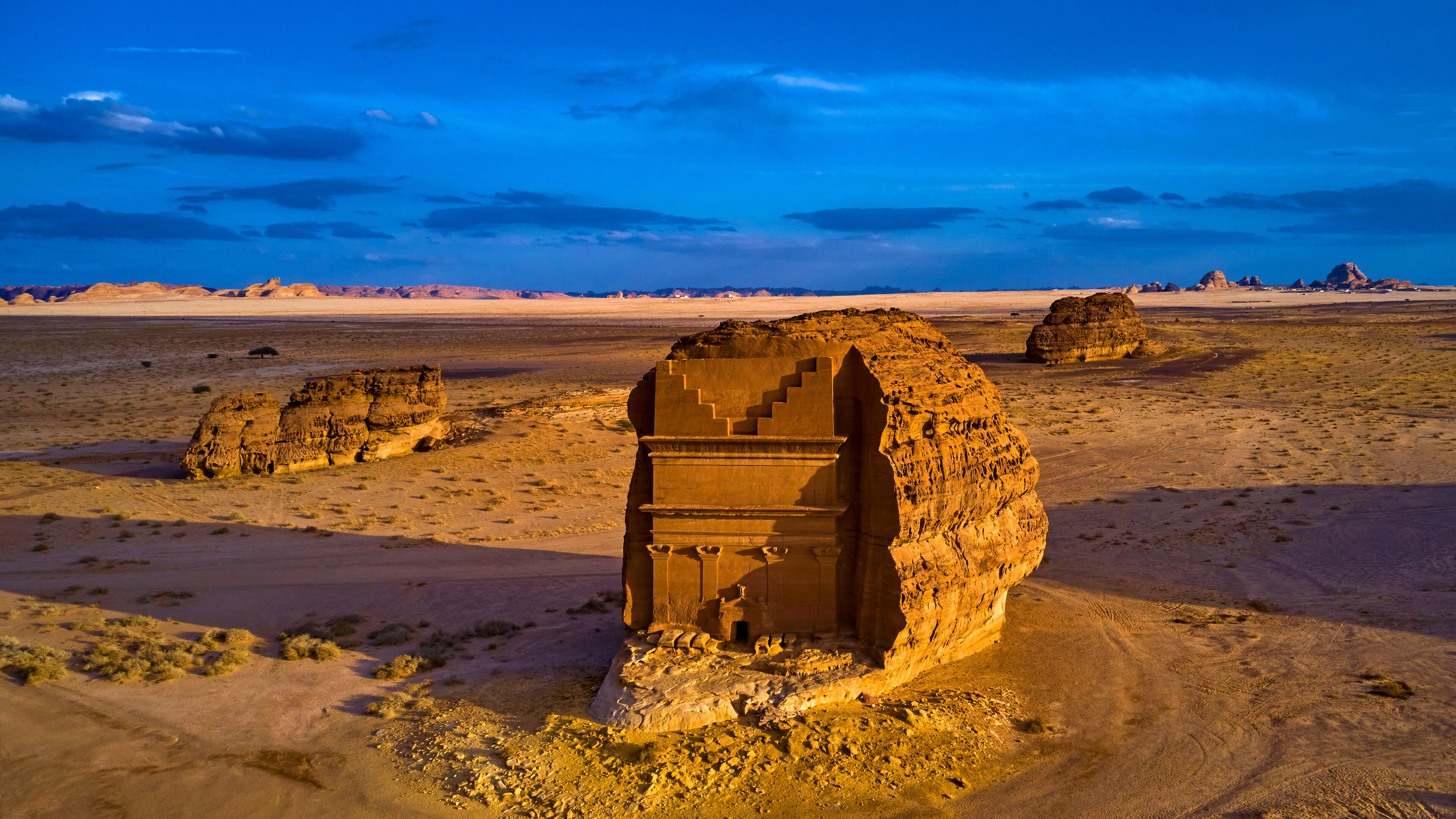 A majestic 4K wallpaper revealing a colossal Nabataean tomb, meticulously carved into a towering rock formation, dominating the expansive, arid desert of Hegra, Mada'in Saleh, Saudi Arabia. The golden hour sunlight bathes the ancient facade and surrounding sandy terrain in warm hues, strikingly contrasted by the deep, tranquil blue sky streaked with clouds.