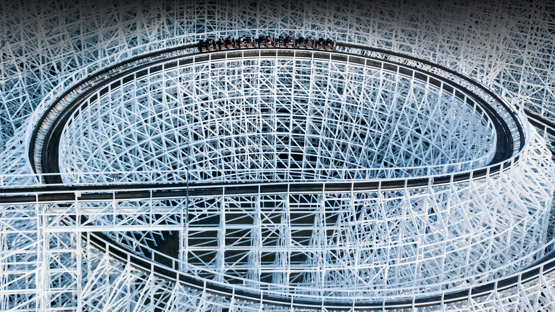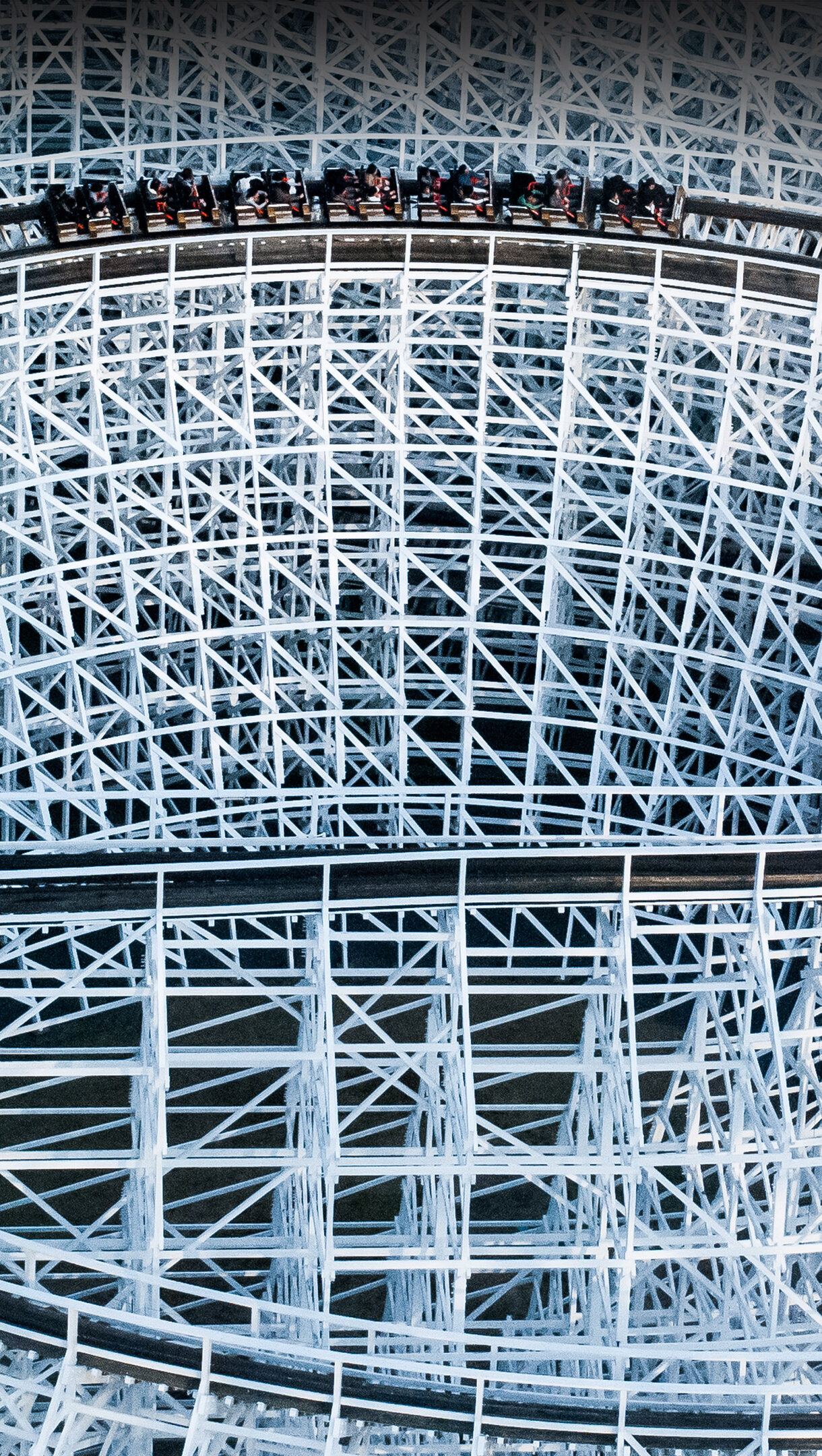 An exhilarating 4K wallpaper capturing the massive white lattice structure of a roller coaster at Nagashima Spa Land, with a train full of riders winding through its curves. The intricate web of white beams creates a dizzying pattern, emphasizing the dramatic scale and thrilling descent of the dark coaster track.