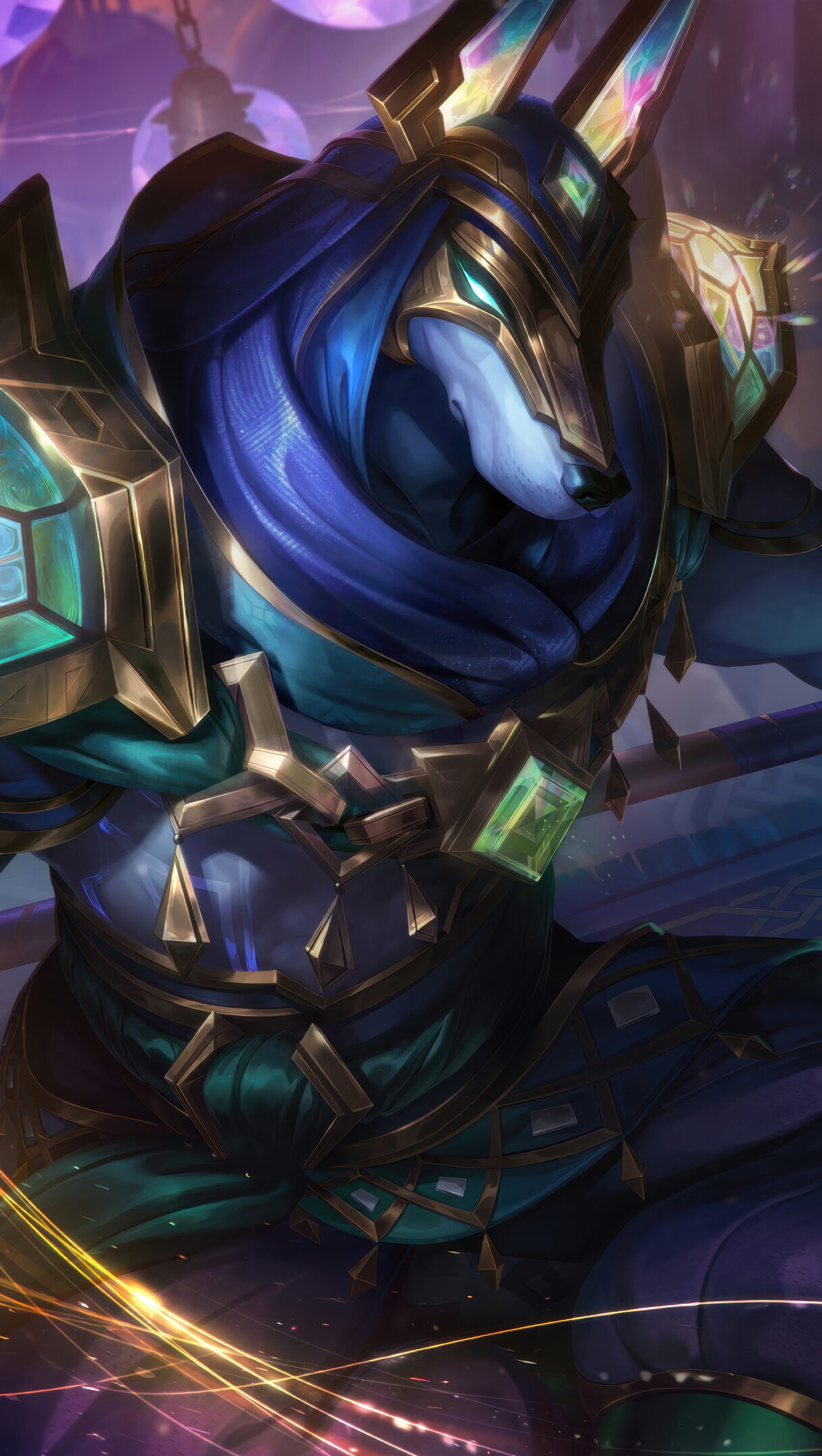 A captivating 4K wallpaper features Nasus, an Anubis-like figure, adorned in ornate golden and iridescent armor with flowing teal robes, dynamically gripping a glowing axe within a mystical, dimly lit temple setting. The swirling golden light trails and vibrant, jewel-toned accents on his armor and weapon create a powerful and enchanting atmosphere.