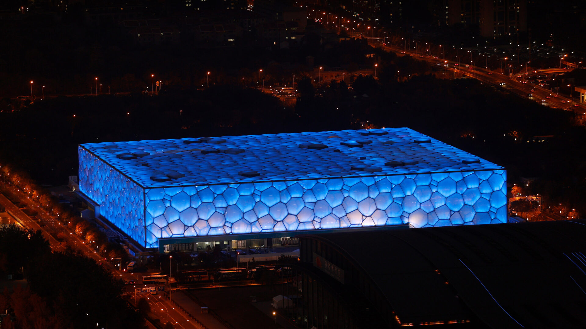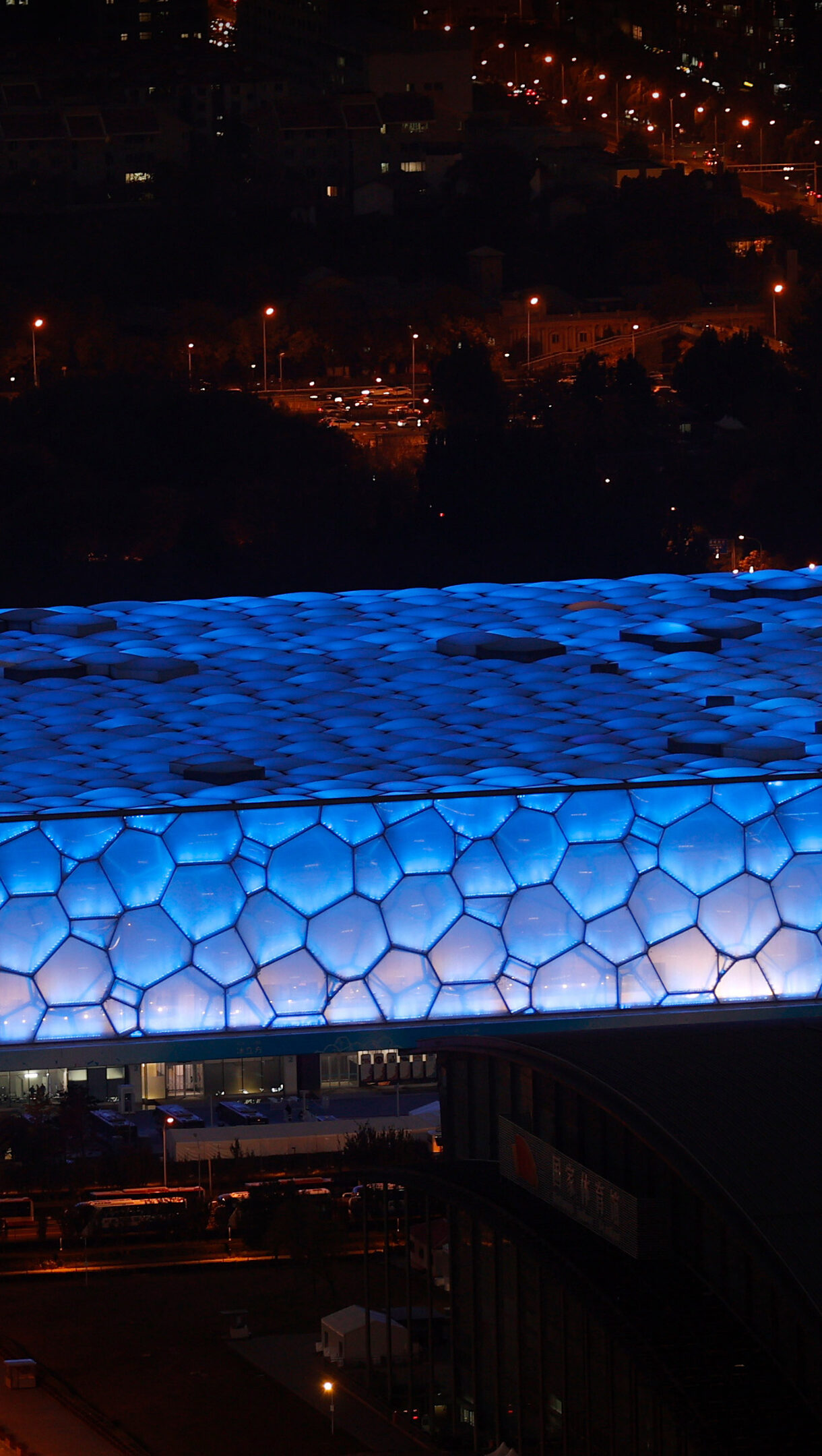 A captivating 4K wallpaper showcases the National Aquatics Center in Beijing, China, brilliantly lit at night within a bustling city landscape. Its iconic exterior glows intensely with a vivid blue illumination, highlighting its unique bubble-like hexagonal facade against the dark sky and surrounding orange streetlights.