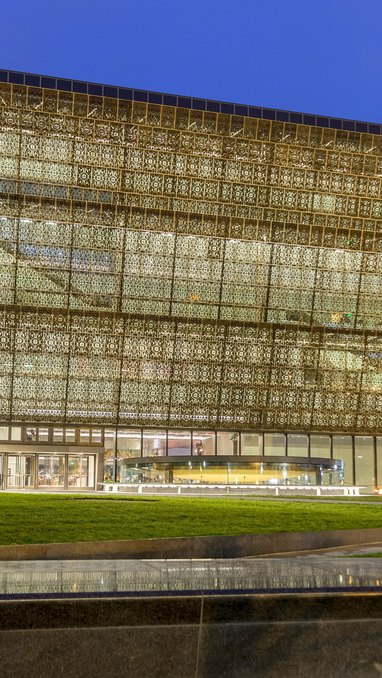 A magnificent 4K wallpaper showcasing the National Museum of African American History and Culture in Washington DC at night, with the Washington Monument rising majestically in the background. Its intricate, bronze-hued corona panels glow warmly against the deep twilight sky, reflecting subtle light onto the surrounding green lawn and a calm water feature.