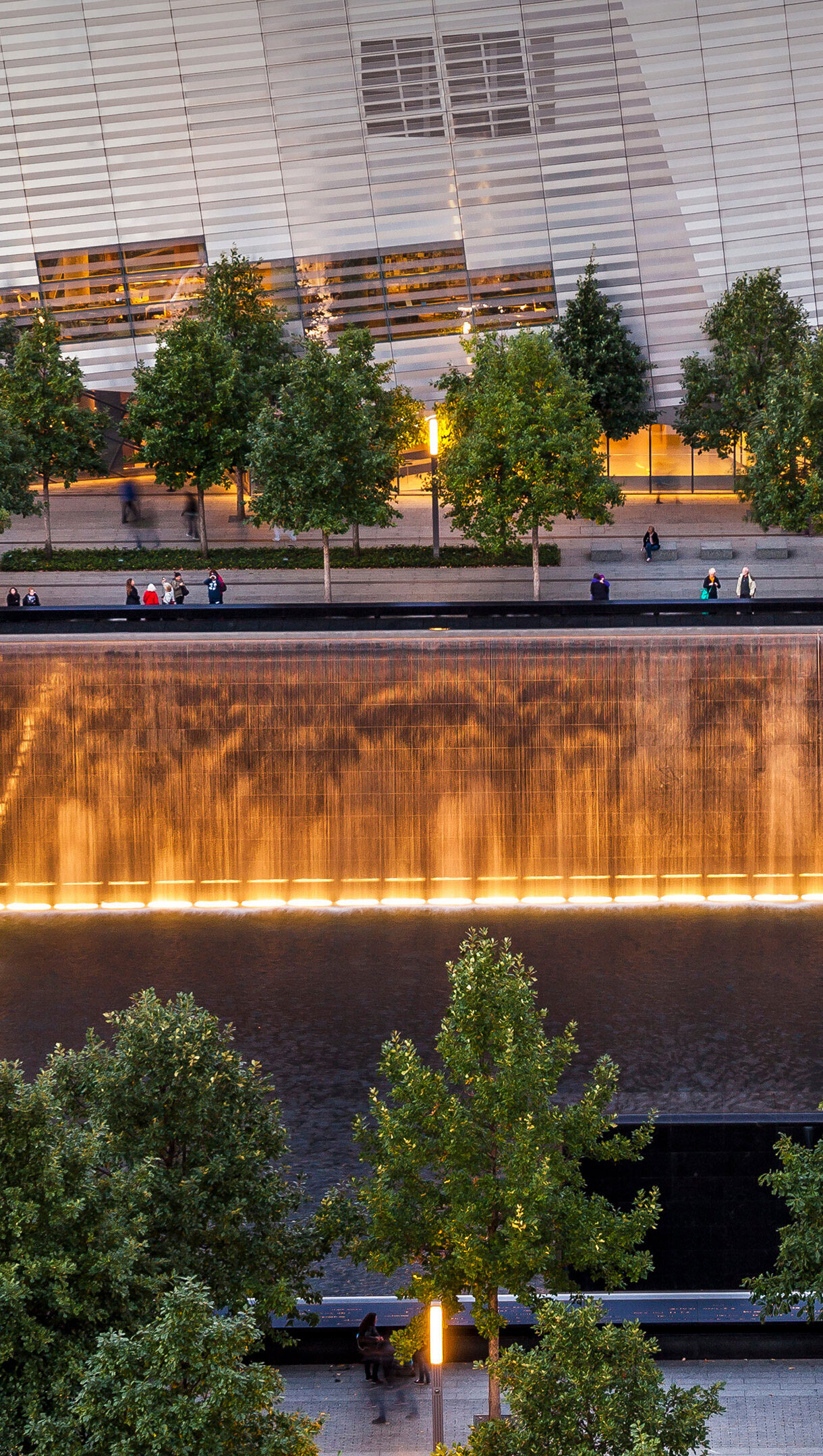 A solemn 4K wallpaper capturing the National September 11 Memorial's twin reflecting pools at dusk in New York City, surrounded by verdant trees. Golden light dramatically illuminates the cascading waterfalls, creating a profound and contemplative mood of remembrance against the twilight.