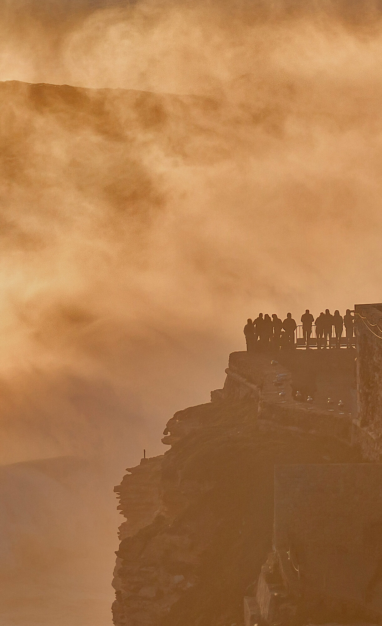 An awe-inspiring 4K wallpaper showcases the Nazaré Lighthouse and Forte de São Miguel Arcanjo in Portugal, perched on cliffs overlooking immense, breaking waves. The colossal waves erupt into a golden cloud of sea spray, backlit by a warm, ethereal light, creating a powerful natural spectacle that captivates onlookers.