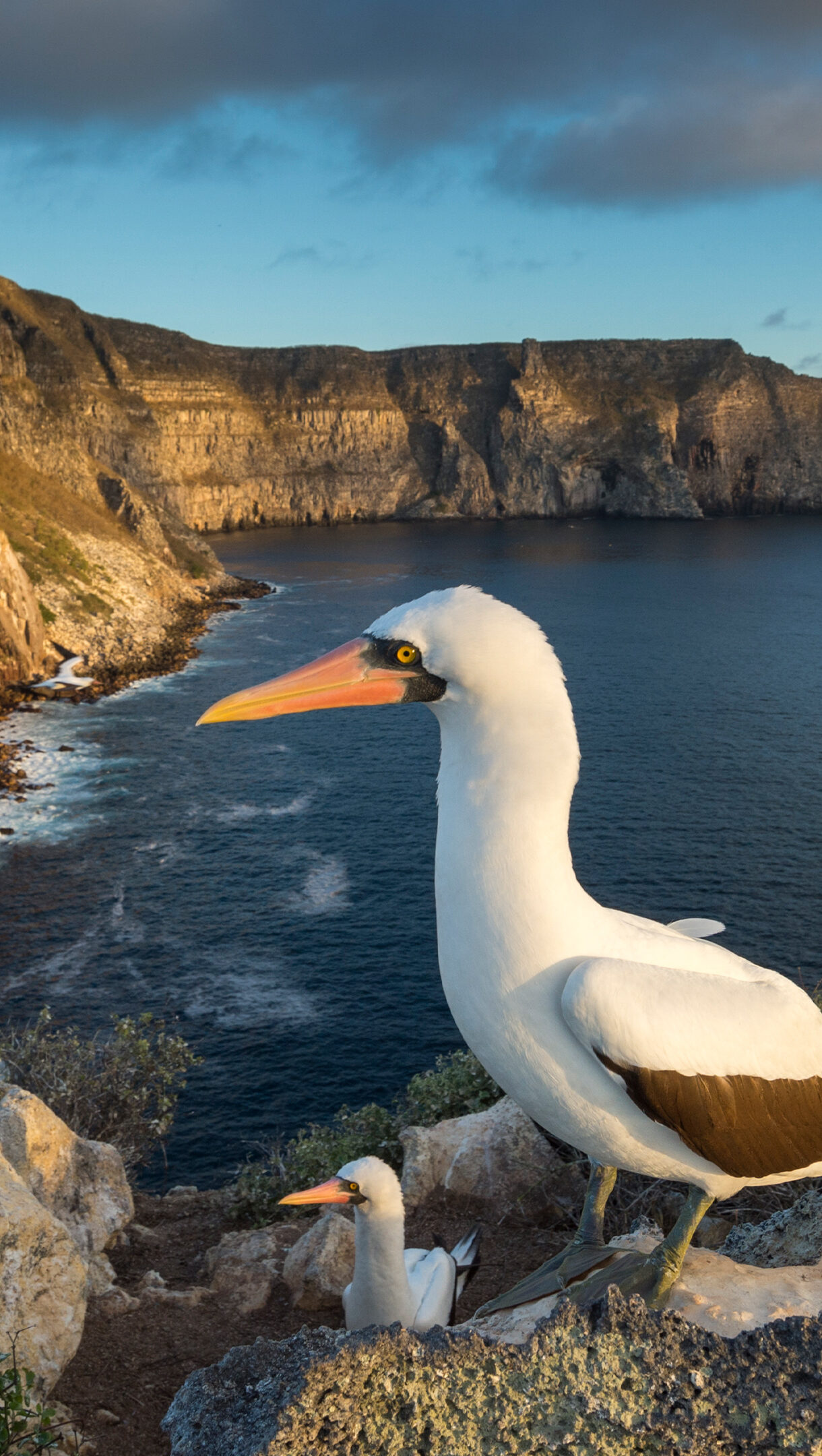 A breathtaking 4K wallpaper showcases several Nazca Boobies perched on the rugged cliffs of Wolf Island, overlooking the vast, deep blue ocean. Golden hour sunlight illuminates the dramatic rock faces and the lead booby's pristine white plumage, creating a serene yet majestic coastal scene.