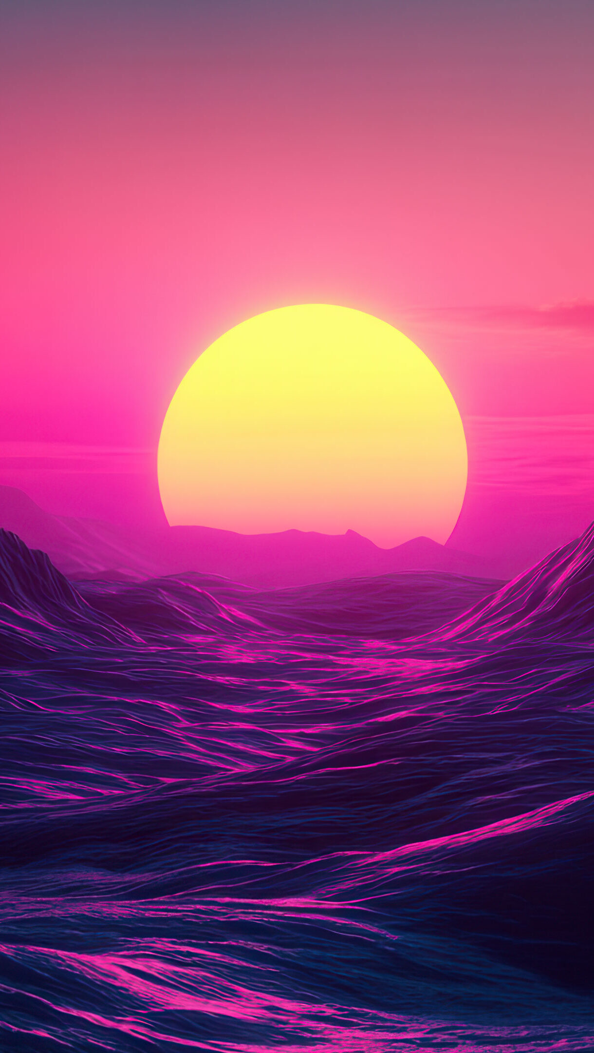 A stunning 4K wallpaper showcasing a vibrant neon sunset casting glowing hues over a majestic mountain range. The vivid colors blend seamlessly into the sky, creating an enchanting and futuristic atmosphere, perfect as a desktop or mobile background.