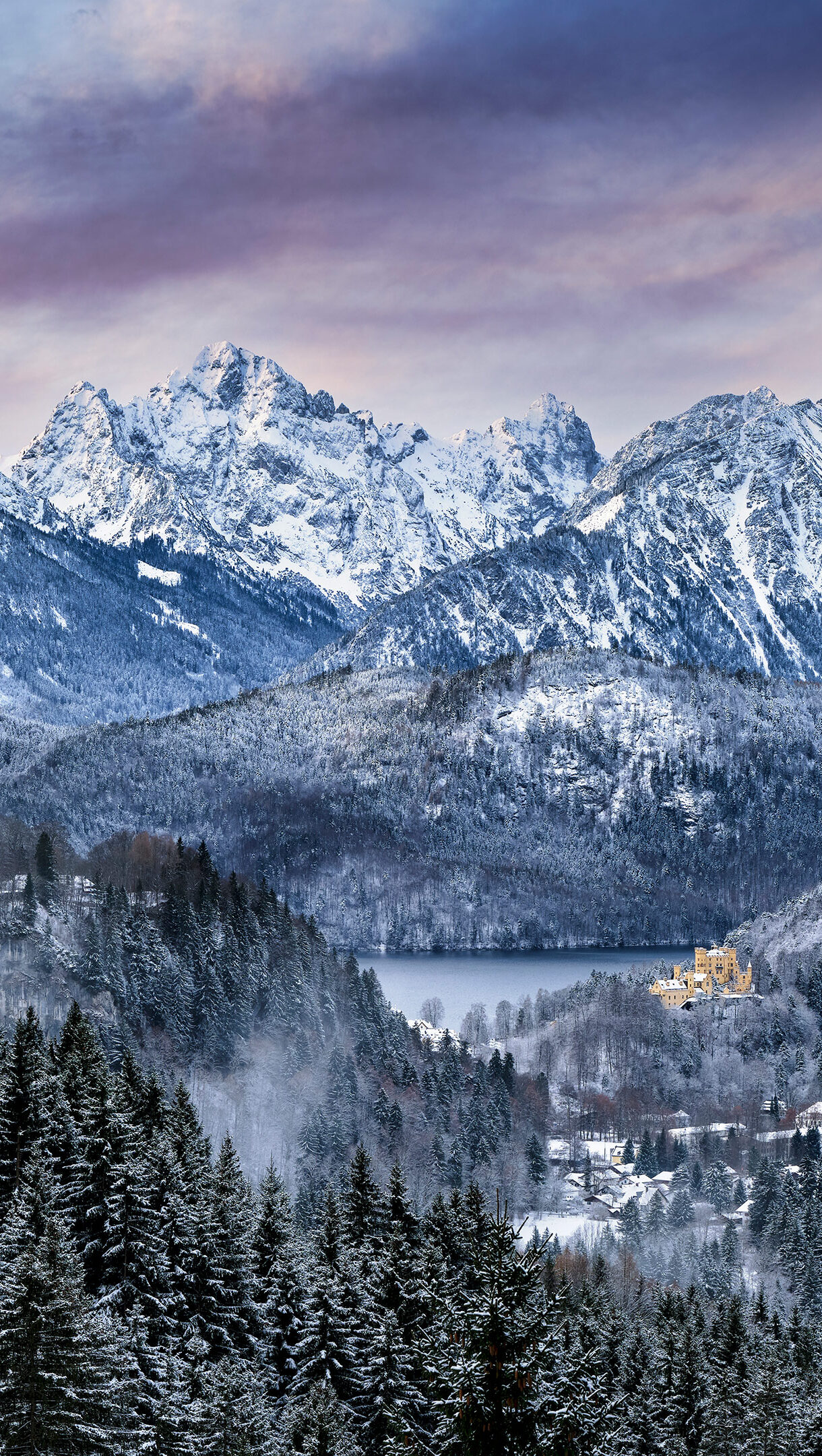 An enchanting 4K wallpaper presents the majestic Neuschwanstein and golden Hohenschwangau Castles nestled within a breathtaking winter landscape. Snow-dusted pine forests blanket the valleys, leading up to dramatic, white-peaked mountains under a serene sky of soft purples and blues, creating a magical and expansive mood.