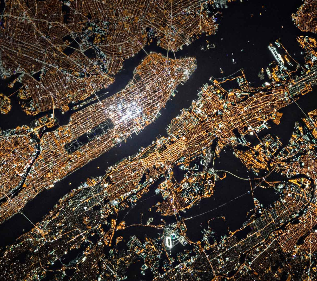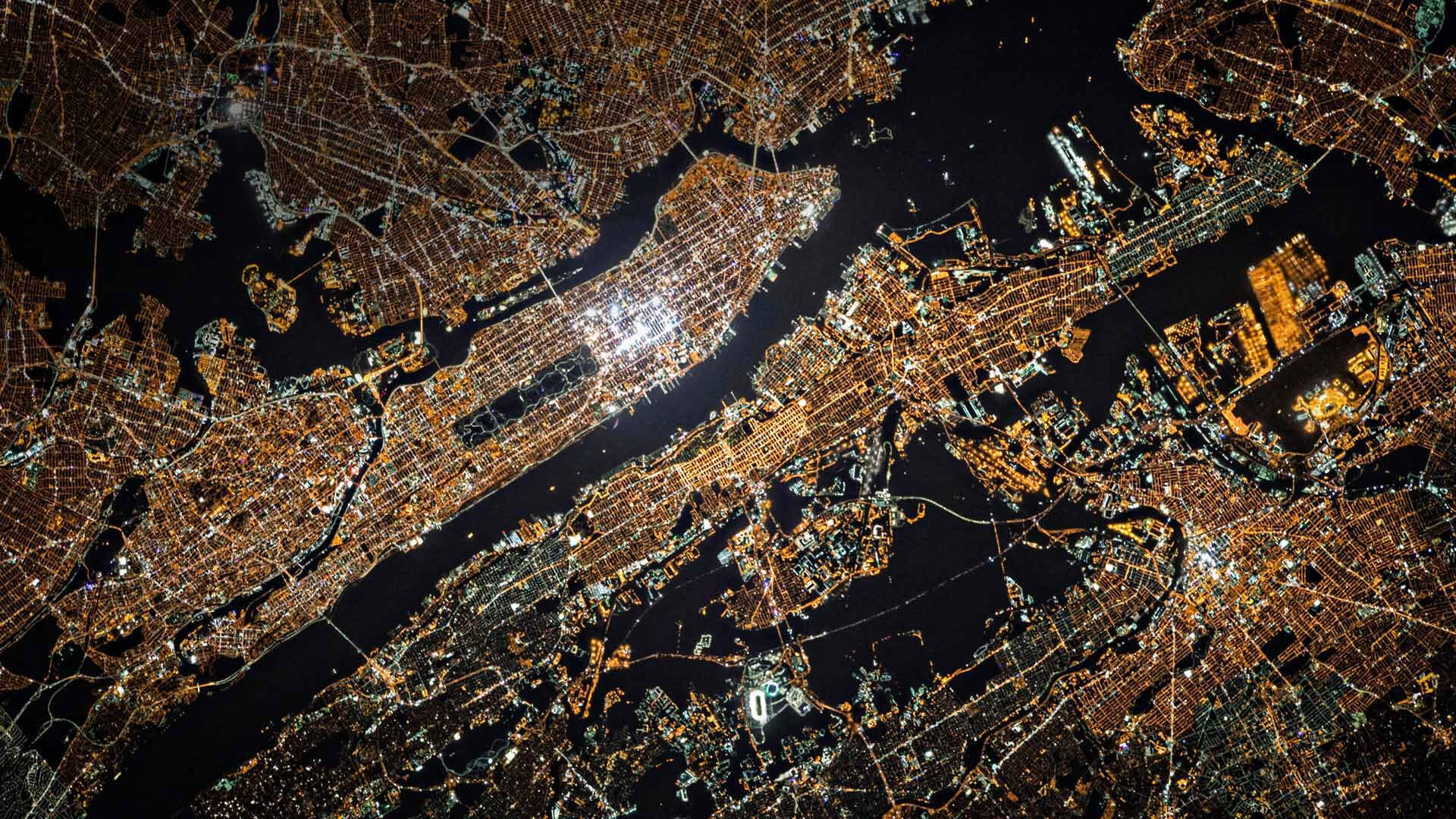 An illuminating 4K wallpaper showcasing New York City as an intricate tapestry of night lights viewed from space. The golden glow of the sprawling metropolis vividly outlines the city's boroughs, rivers, and iconic grid patterns against the deep black of the surrounding waterways and outer space, creating a sense of energetic vastness.