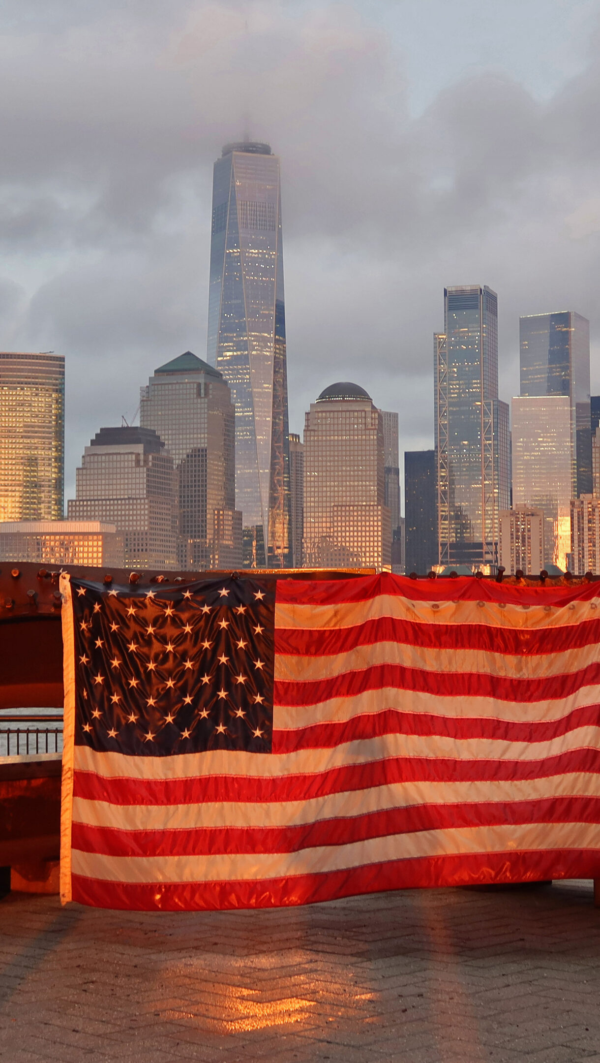 A breathtaking 4K wallpaper showcasing the iconic New York City skyline rising behind a proudly displayed American flag, viewed from Exchange Place in Jersey City. Golden light from the setting sun dramatically illuminates the flag and the mirrored facades of the towering cityscape, casting a powerful, serene mood over the scene.