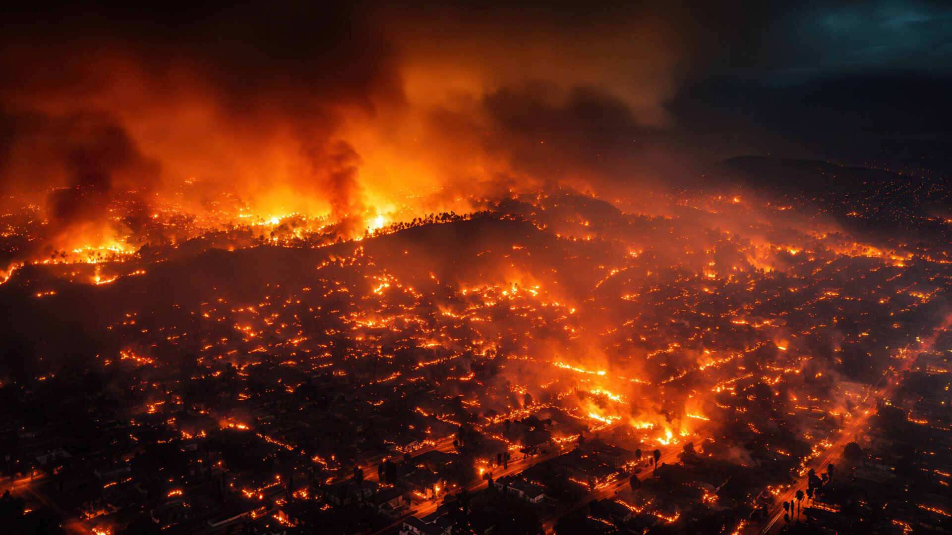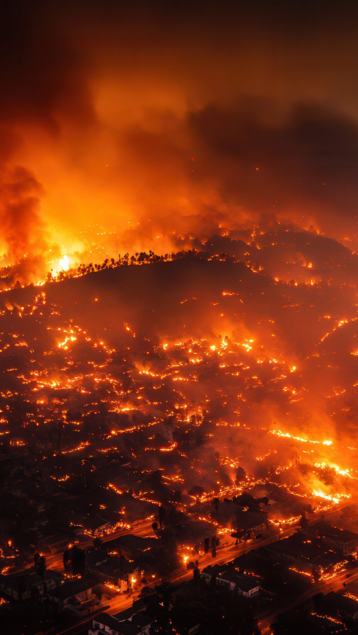 A dramatic 4K wallpaper featuring the Los Angeles skyline engulfed in flames, casting an intense glow across the city. The fiery scene highlights the cityscape's towering buildings amidst a chaotic backdrop, creating a vivid and cinematic visual perfect for your desktop or mobile device.