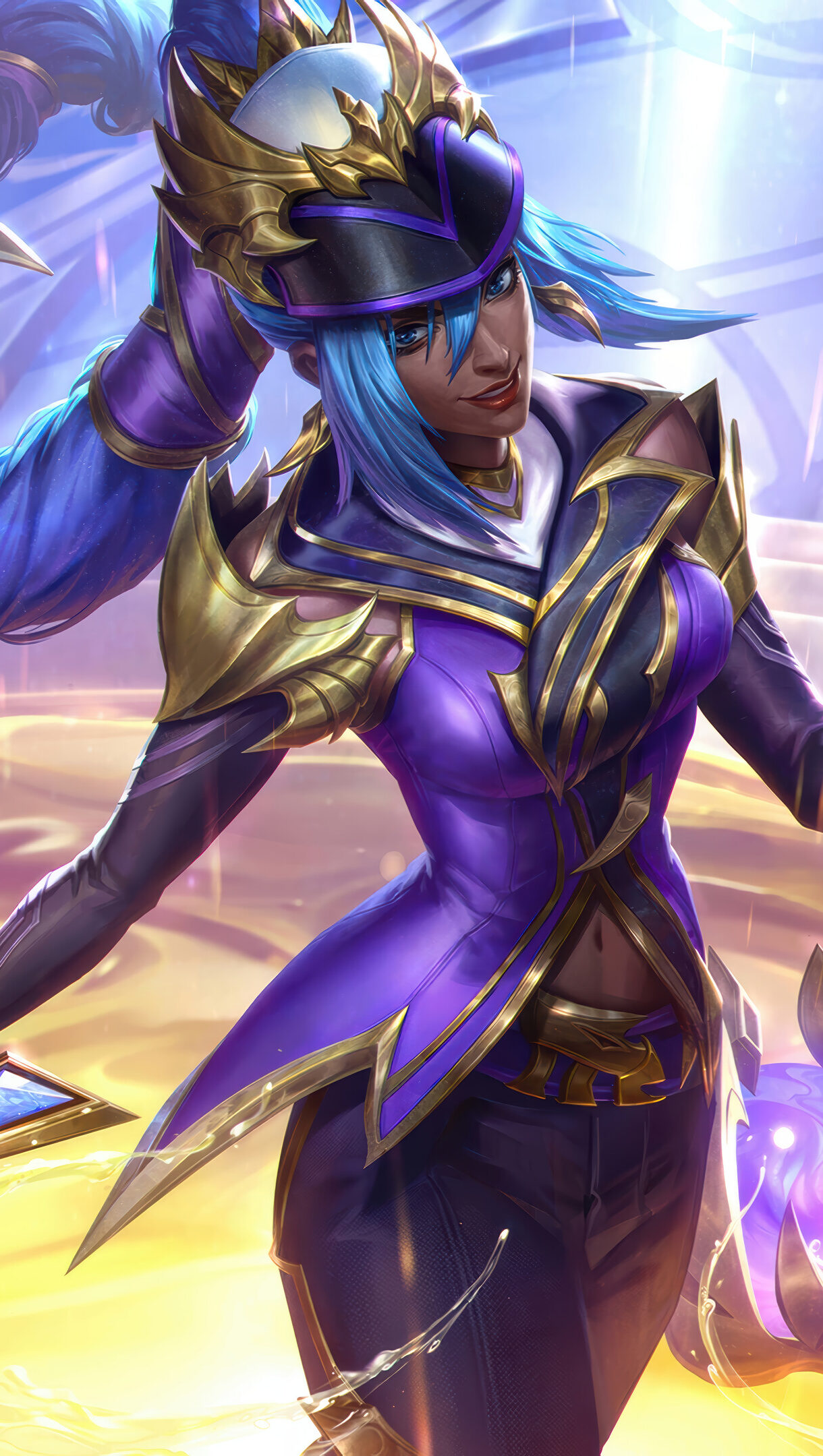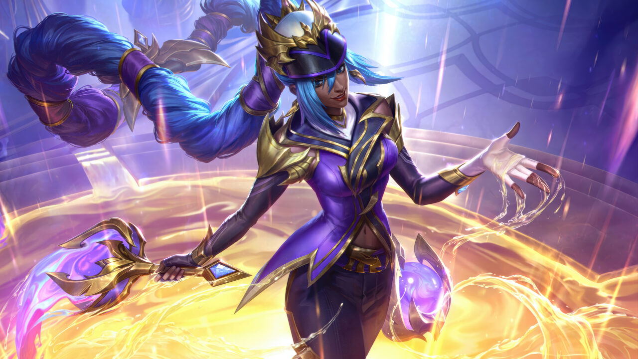 An electrifying 4K wallpaper showcasing Nilah in her Glorious Aigrette skin from LoL Wild Rift, a formidable champion standing confidently in a radiant, mystical arena. Her vibrant blue hair and regal purple and gold attire pop against the powerful golden water energy swirling at her feet and a shimmering violet-blue backdrop, evoking a sense of immense power and grace.