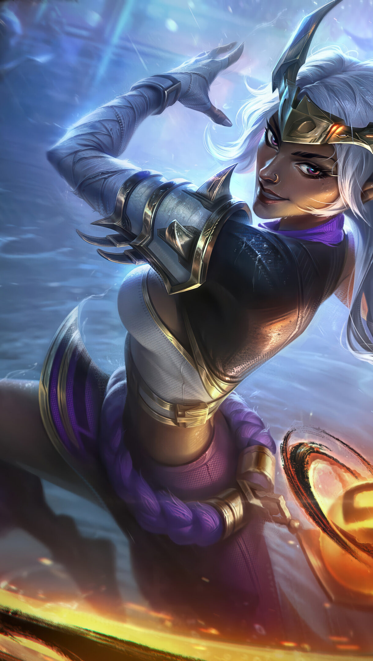 A stunning 4K wallpaper featuring Nilah, the Inkshadow Champion, poised in a dynamic action pose within a swirling, dark fantastical realm. The dramatic interplay of her glowing golden fluid-whip and radiant energy against the cool blue and dark shadowy background evokes a powerful, enigmatic mood.